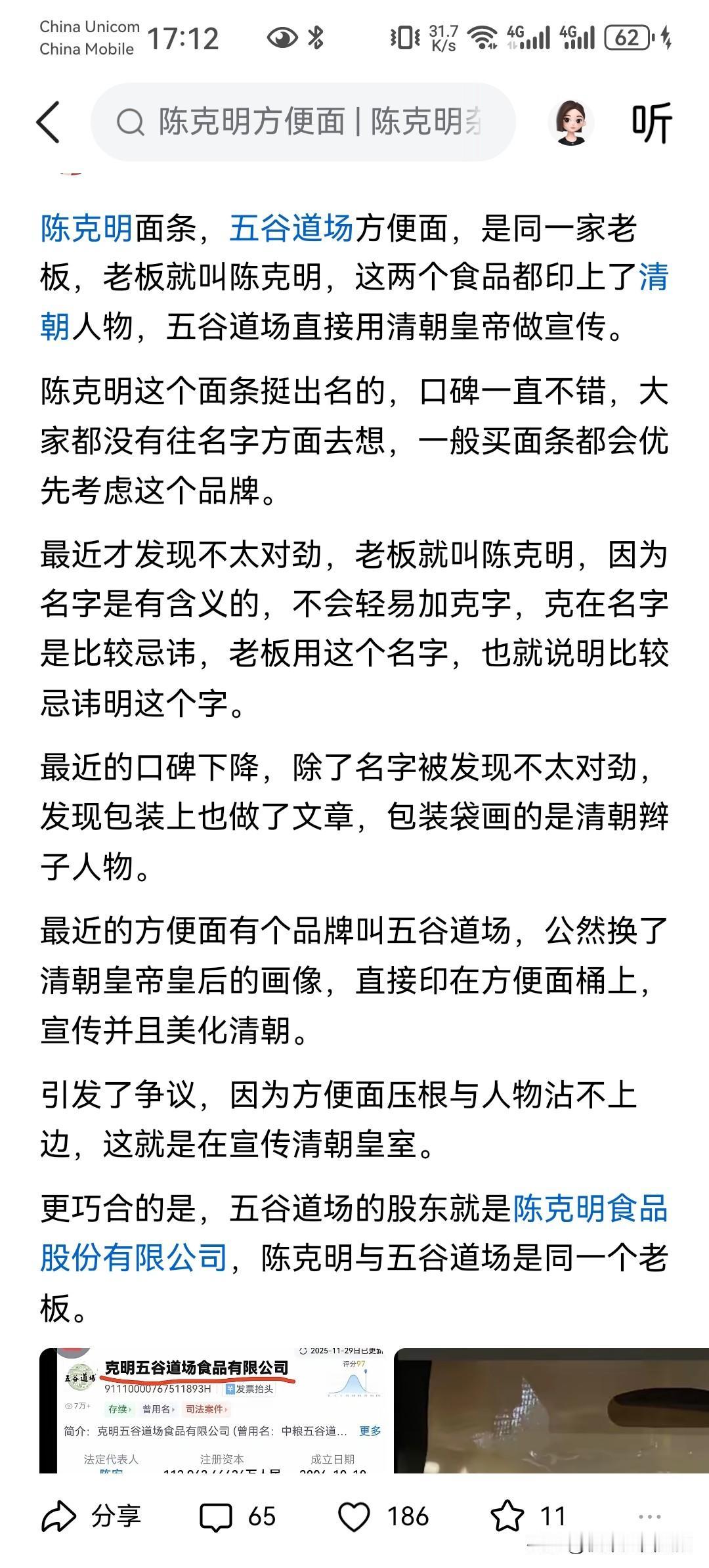 头条有人说陈克明面条包装使用清朝皇室人物,这是对清朝的宣扬,然后扯到立场问题,评论区一帮没文化的居然支持,说什么不买人家的面条了等等。 我只能说,这样的观点有人支持,那就是添加剂吃多了的后遗症,而且后遗症群体还不小。太可怕了,这以后凡是看到的图片或者文字,都能扯上立场问题,这特么是文字狱的翻版。 我想,这大抵不是莫须有,这比莫须有更可怕,持有这种观点的人,脑子是多少有点问题的。