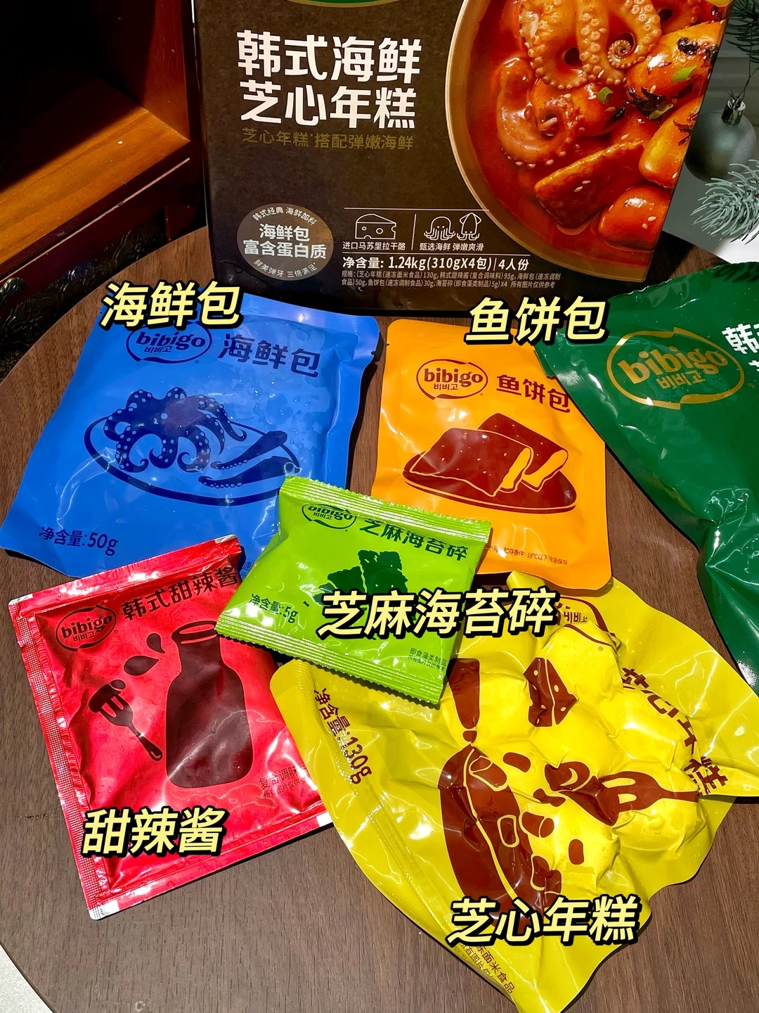 每盒里面有4⃣️袋独立装年糕,里面有整颗大章鱼、鳕鱼鱼饼、芝士年糕(进口马苏里拉芝士含量高达19%)、海苔碎