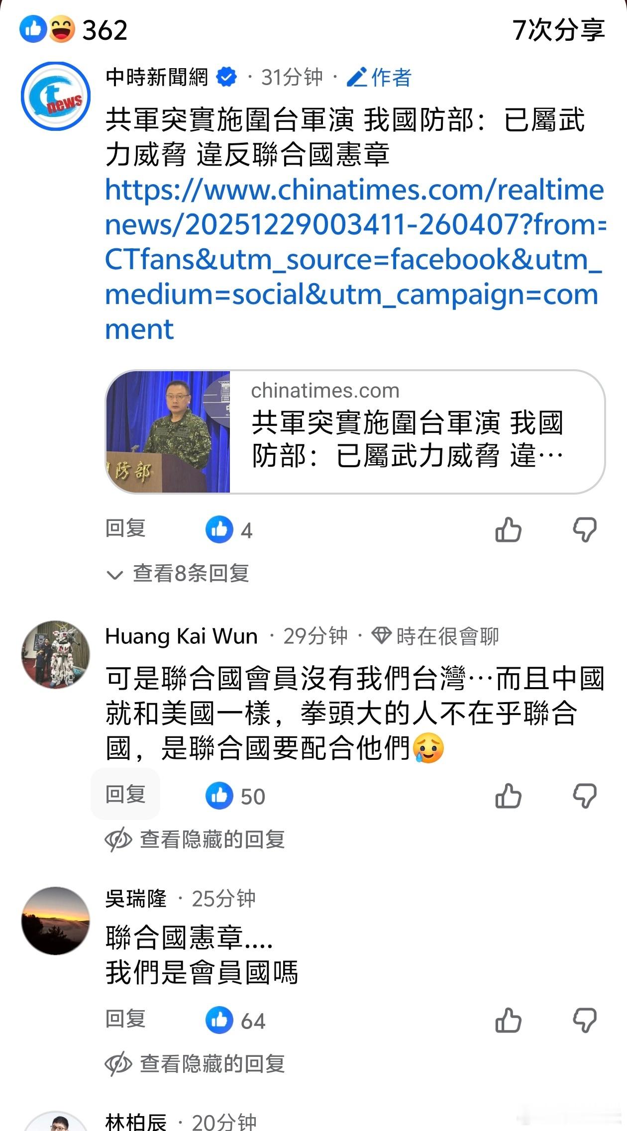 面对锁岛军演,台湾 民进党当局称解放军已属武力威胁,违反联合国宪章。台湾网民反问:联合国宪章....我们是会员国吗?又反问:可是联合国会员没有台湾…傻孩子,台湾是中国一部分,中国自然是联合国会员。但如果你不是中国一部分?嘿嘿……那就不受保护了。歼20现身对台演习
