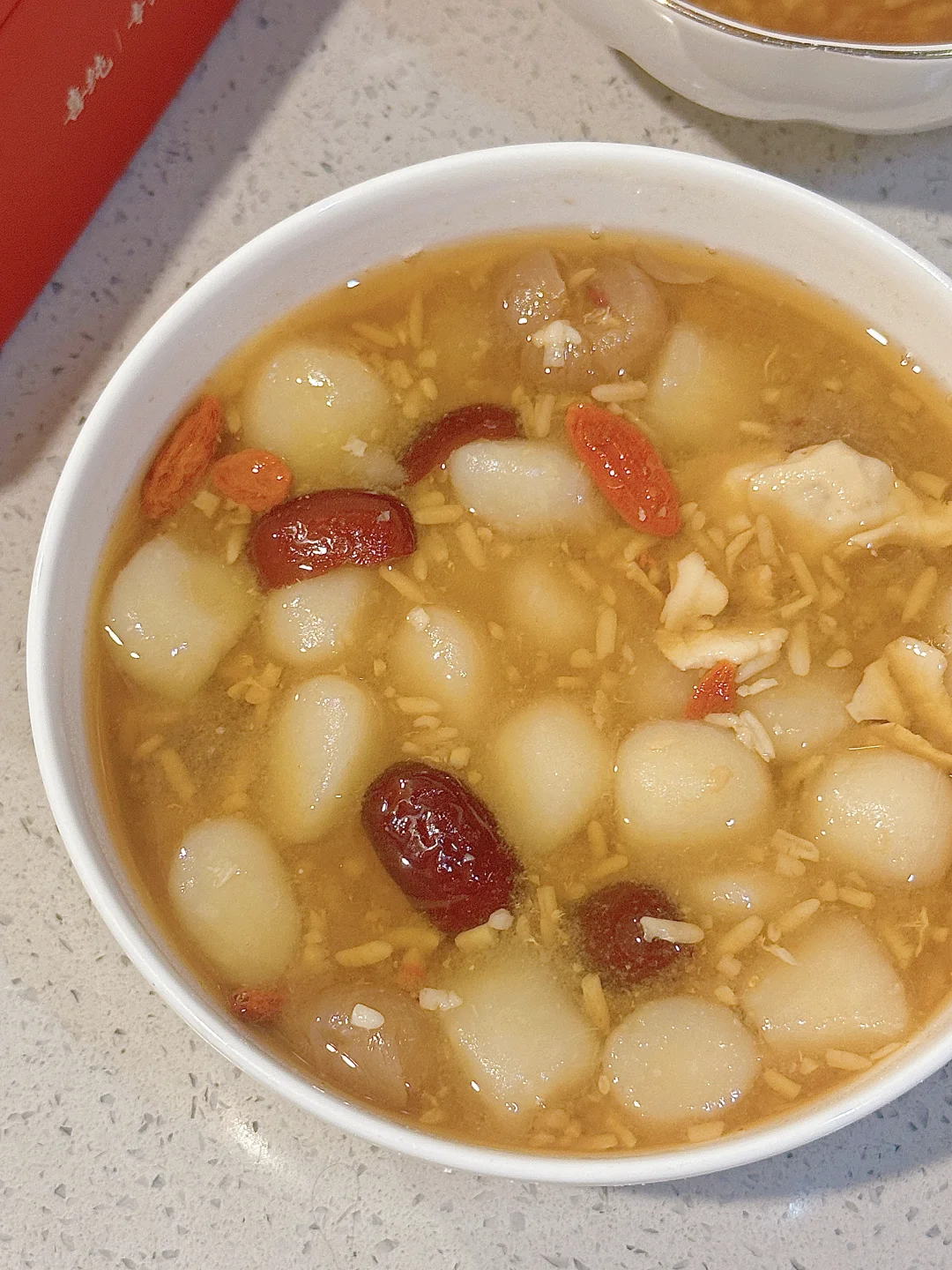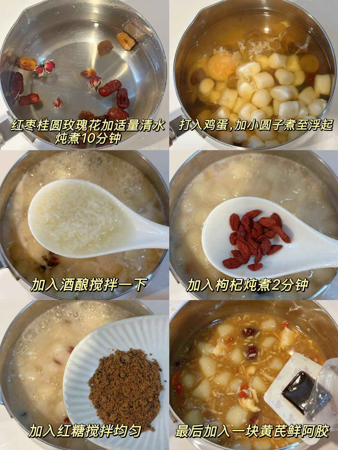 3️⃣ 倒入酒酿,枸杞,红糖炖煮2分钟,加入阿胶块搅拌融化就可以出锅啦~