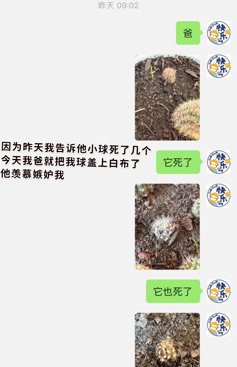 昨天我告诉仙人球爹他的小球孩儿没了几个[暗中观察R]仙人球爹羡慕嫉妒我的健康大球!他给我球盖了白布[失望R]还拿刺扎我球[哭惹R] 这么大人了真幼稚
