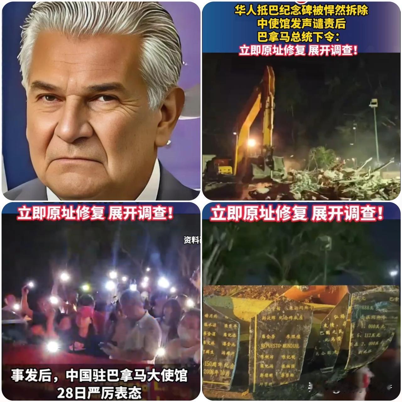 震怒! 巴拿马深夜强拆华人纪念碑, 总统痛斥野蛮行径,中方严正交涉 当地时间12月27日深夜,巴拿马阿赖汉市政府在未提前通知、未沟通协商的情况下,动用重型机械强行拆除了位于巴拿马运河旁的中巴公园及华人抵巴150周年纪念碑,引发轩然大波。 这座2004年落成的纪念碑,由中国政府资助、华人社团筹资建成,是为铭记171年来华人参与巴拿马铁路、运河建设的历史贡献,更是中巴友谊的重要象征。此前华人社团多次主动提出出资修缮,中国驻巴使馆也表达了翻修支持,却均被地方政府无视。 事件发生后,巴拿马总统穆利诺公开谴责此举为“不可原谅的野蛮行径”,强调华人社群“理应得到全部尊重”,并下令在原址立即修复。中国外交部及驻巴使馆先后发声,对强拆行径表示强烈愤慨,已向巴方提出严正交涉,要求彻查此事、纠正错误。 国际社会评说:联合国教科文组织相关专家指出,历史纪念碑是人类共同记忆载体,未经协商的强拆行为违背文化保护原则;拉美华侨华人社团联盟谴责此举伤害全球侨胞感情,呼吁尊重华人历史贡献。 个人认为:纪念碑承载的是历史记忆与民间情谊,绝非可随意拆除的建筑。阿赖汉市政府的单边行为,既无视历史,也违背民心。好在中巴中央政府的及时介入,让友谊有了修复的可能。 欢迎评论区讨论,你如何看待这起伤害中巴情谊的强拆事件? 巴拿马总统