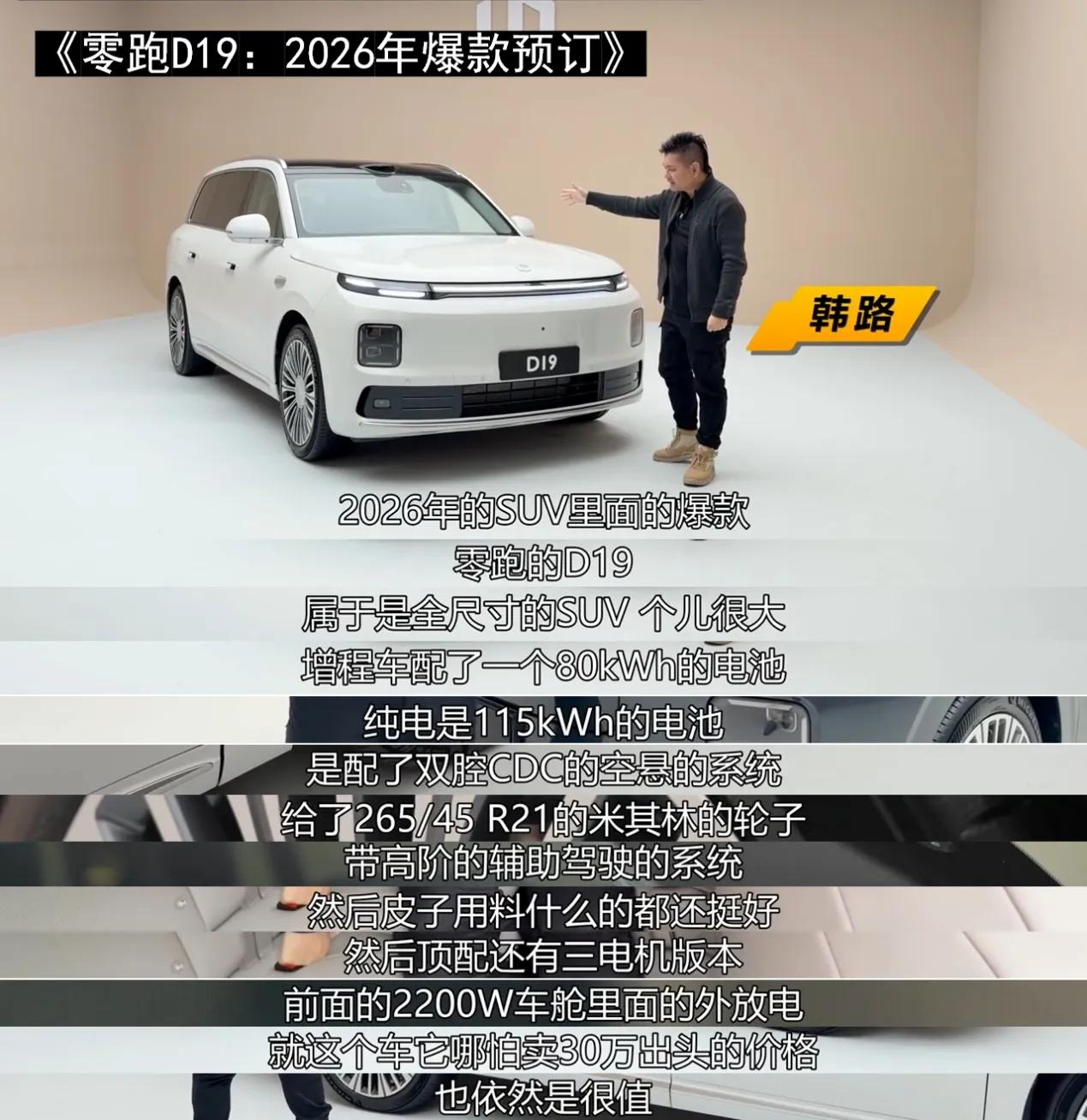 零跑D19品鉴:创新与实用的完美结合! 这几天看了几个头部自媒体对零跑D19的实车品鉴,彻底打消了我对这款SUV竞争力的疑虑,因为它的很多点让你感觉不玩虚的,就是以契合用户需求为导向的。 首先是超大前备箱,之前零跑高管的开箱就已经展示过了,不仅容积够大,还支持外放电,搭配官方厨房套件,露营煮火锅、热食材都能搞定;然后我们发现这个前备箱不仅有效隔绝了很多物品的串味,而且在车头朝外时还不影响你存取物品。 再就是车规制氧机,它通过对氧气分离和空调系统供氧,具备弥散或鼻吸两种方式,8L/min流量在高原自驾或长途驾驶时,能有效缓解缺氧疲劳,乘坐体验舒适升级。 然后,这款车的空间也很大,二排腿部近三拳,三排即便在二排留有一拳四指空间时,腿部仍超一拳,还带加热和遮阳帘等,应该说三排的乘坐感受都是VIP级别的。 昨晚,在零跑十周年大会上已经宣布,D19将在明年4月份上市。30万级能有百万级的豪华体验,D19确实值得大家持续关注。