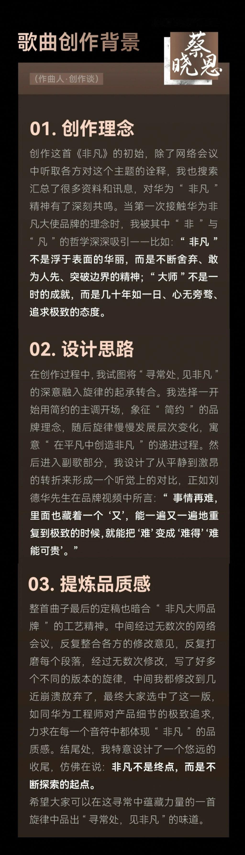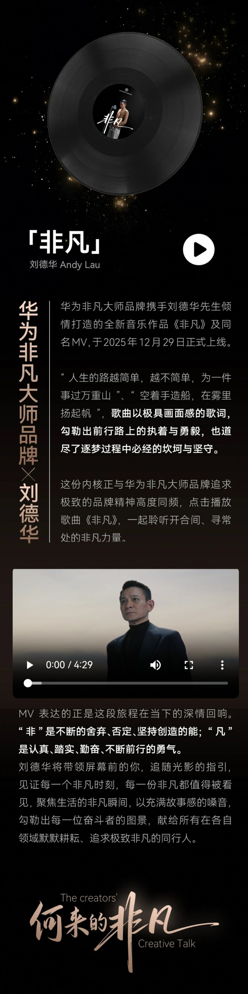 刚上线就直接霸占歌单C位还有谁!华仔新歌《非凡》炸场来了!华为音乐让“听觉开挂”🔥12.29华为音乐就能独家解锁,唐恬作词+蔡晓恩作曲黄金配置,配上华仔四十余年沉淀的嗓音,一句“何来的非凡 不过一盏孤灯赴平凡”直接戳中追梦人的心巴,MV里华仔见证舞者、运动员的坚守,如同他自己深耕艺坛的真实写照,和华为非凡大师的匠心精神狠狠共鸣!华为音乐每首歌都能开超高清音频或空间音频,前者听清嗓音的细腻质感,后者直接沉浸式录音棚(纯享版!环绕音效让歌词里的坚持与感动瞬间具象化)!想get歌曲制作人的创作灵感,召唤音乐助手秒解锁!记不起老歌歌名,AI搜凭零星线索就能精准命中!华为手机升级到HarmonyOS 5.1及以上,右滑负一屏冲“鸿蒙有礼”,12月31日前签到必抽红包,还有机会赢华为音乐超钻会员!赶紧打开华为音乐搜“非凡”,在天王歌声里看见闪闪发光的自己!华为非凡大师品牌主题曲正式上线 我的年度听歌报告以非凡收尾 网页链接