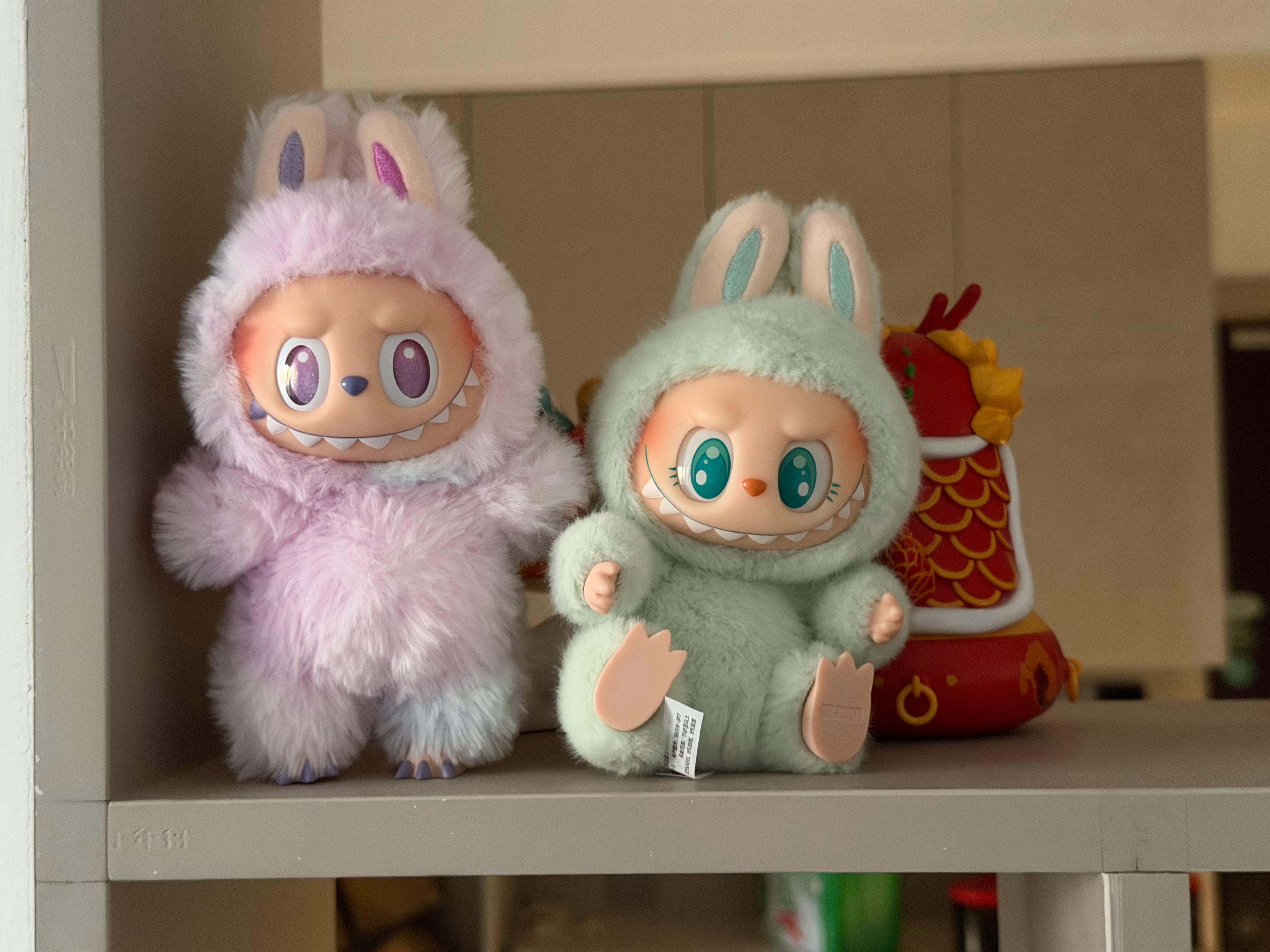 泡泡玛特开始五折甩卖了看了一下我家里还有两个labubu,一个是前方高能,一个是马卡龙,这都是当年最经典的款式,一个站着,一个坐着。好看确实是好看,但是没用也没用,这也导致了后续没有啥发展空间,也就是昙花一现。