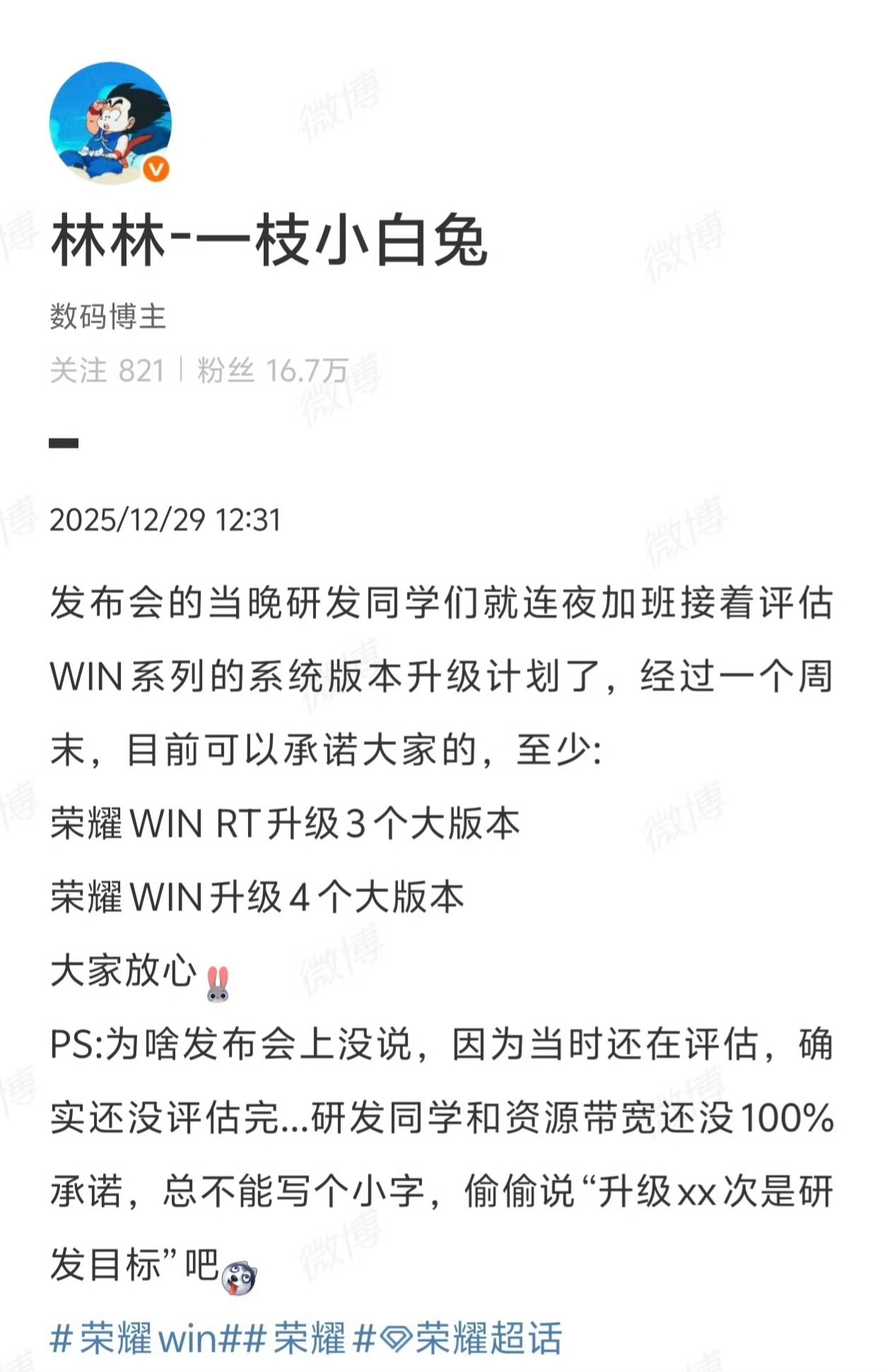 荣耀WIN可以放心冲了WIN RT会有3个大版本更新WIN 会有4个大版本更新这是目前可以保证的,不排除还有后续更新计划,而且看这机子首销爆了,销量跟上了,OTA更新速度和次数肯定也会跟上。