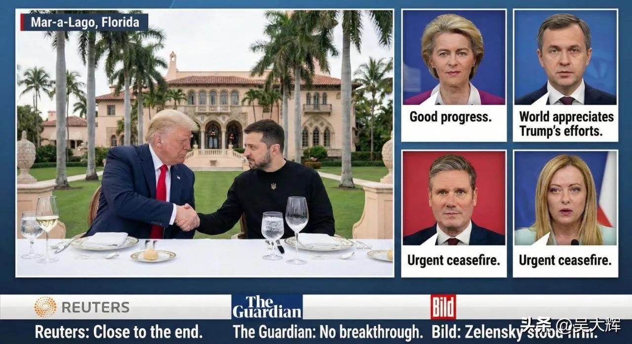 特朗普一句话反转俄乌棋局:俄罗斯愿帮乌克兰。这剧本翻转的让人瞠目结舌啊……。当地时间12月28日,美乌海湖庄园会晤刚落幕,特朗普就抛出重磅表态:普京对俄乌和平“态度认真”,俄罗斯不仅支持停火,还愿意助力乌克兰重建 。这席话让乌媒直呼“听起来很奇怪”,毕竟前一天普京还警告,若乌不愿和谈就以武力解决所有问题 ,这般180度反差堪称国际政坛的“魔幻剧情”。 特朗普口中的“善意”,更像美俄提前通气后的默契表演。要知道会晤前美俄已进行长时间通话,双方立场早已对齐,泽连斯基不过是带着“既定剧本”赴约 。最明显的佐证是,曾誓言“公投是领土问题唯一合法途径”的泽连斯基,会后突然变脸称和平协议可由议会表决,还吐槽海外选民投票设施难建,全然忘了此前的坚定立场 。这波反转恰印证了外界猜测:在美俄博弈中,乌克兰早已沦为可随意调整的棋子,正如反对派领导人梅德韦丘克此前直言,泽连斯基的公投表态本就是“政治闹剧”。 欧盟、英意等国忙着喊“立即停火”,路透社称冲突接近热战尾声,但顿巴斯等核心争议仍悬而未决 。特朗普的表态看似美好,实则是将乌克兰的命运绑上美俄利益交换的战车。毕竟当“帮助”来自曾经的交战方,背后藏着的恐怕不是善意,而是各方权衡后的利益算计——乌克兰的重建之路,终究难由自己做主。