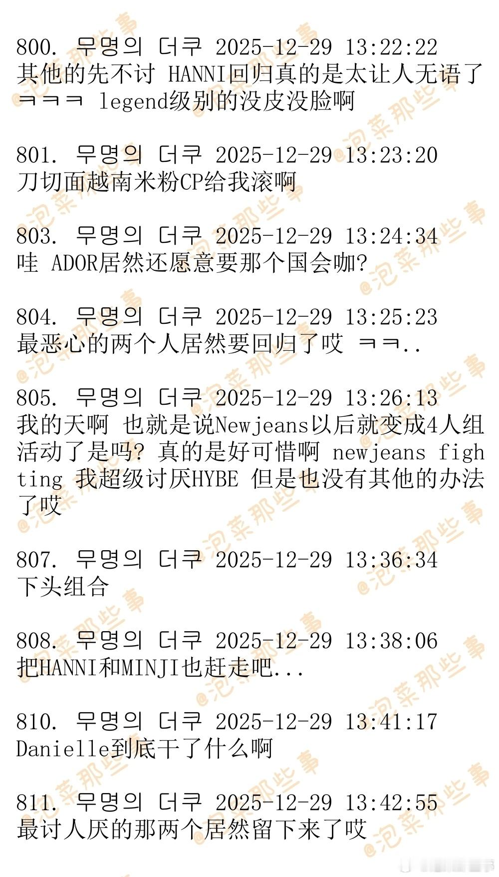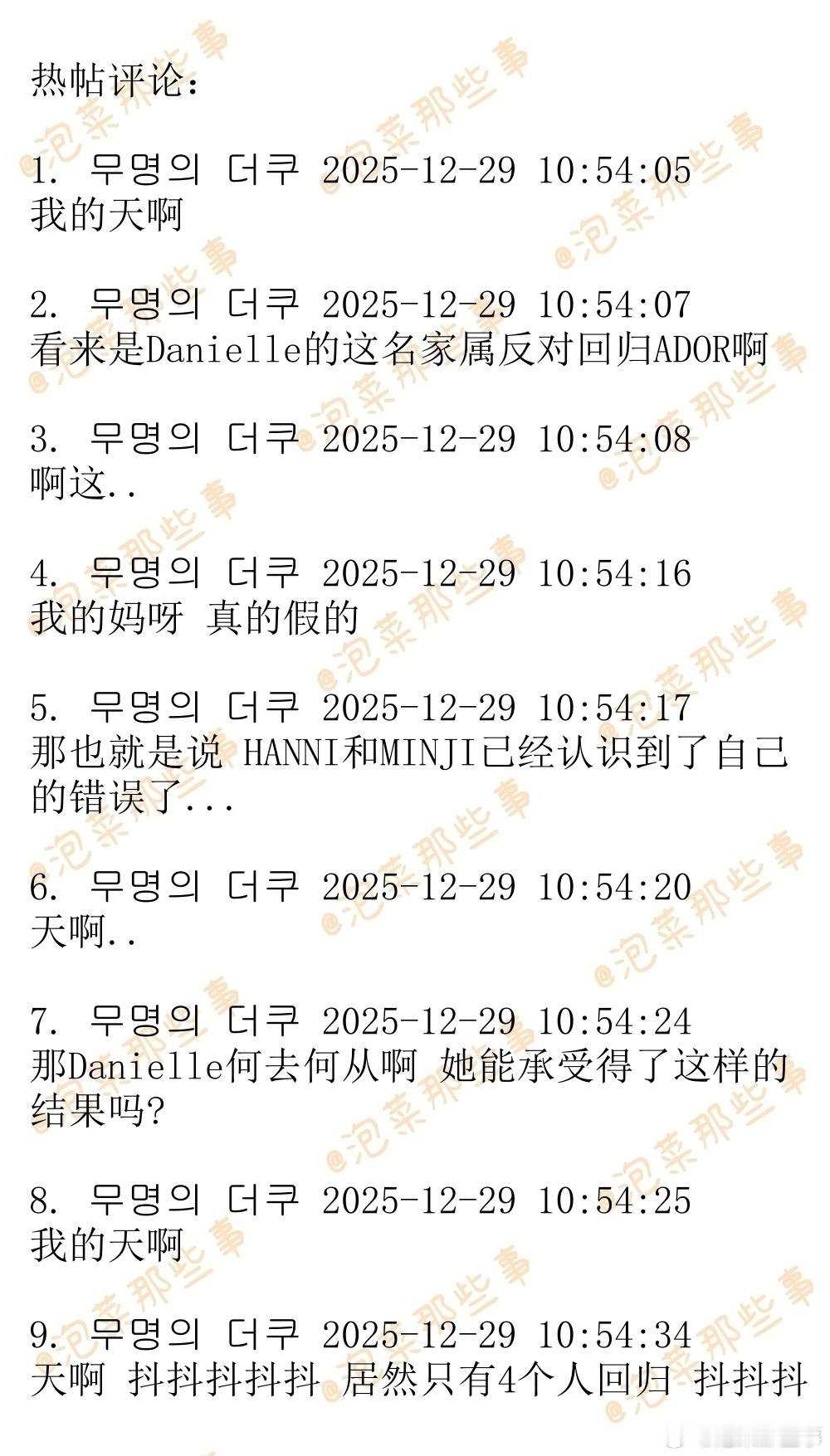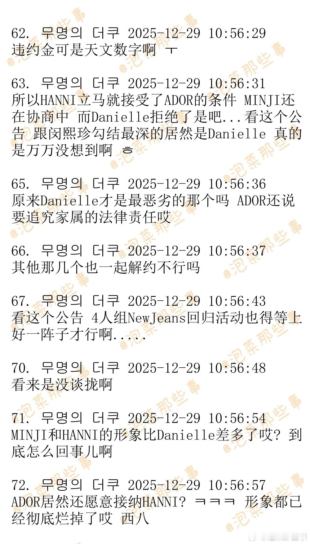 🔥🔥韩网800楼热帖评论翻译🔥🔥HYBE将与Danielle解约Danielle退出newjeans据韩媒报道,ADOR于12月29日发布公告,以“难以继续作为NewJeans成员合作”为由单方面解约Danielle,并表示“Danielle的一名家属及闵熙珍造成了这次纠纷情况,对NewJeans退出ADOR及后续回归ADOR延迟负有重大责任”,将追究法律责任。其他4名成员:Haerin、Hyein已于11月率先回归,Hanni携家属赴韩沟通后确认回归,Minji持续与公司协商中。cr.theqoo