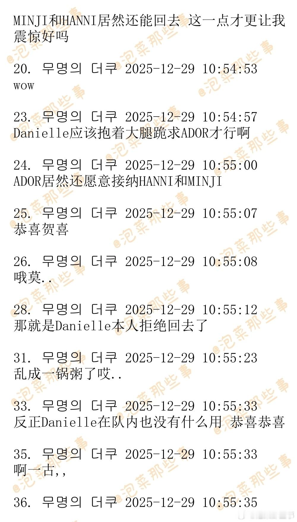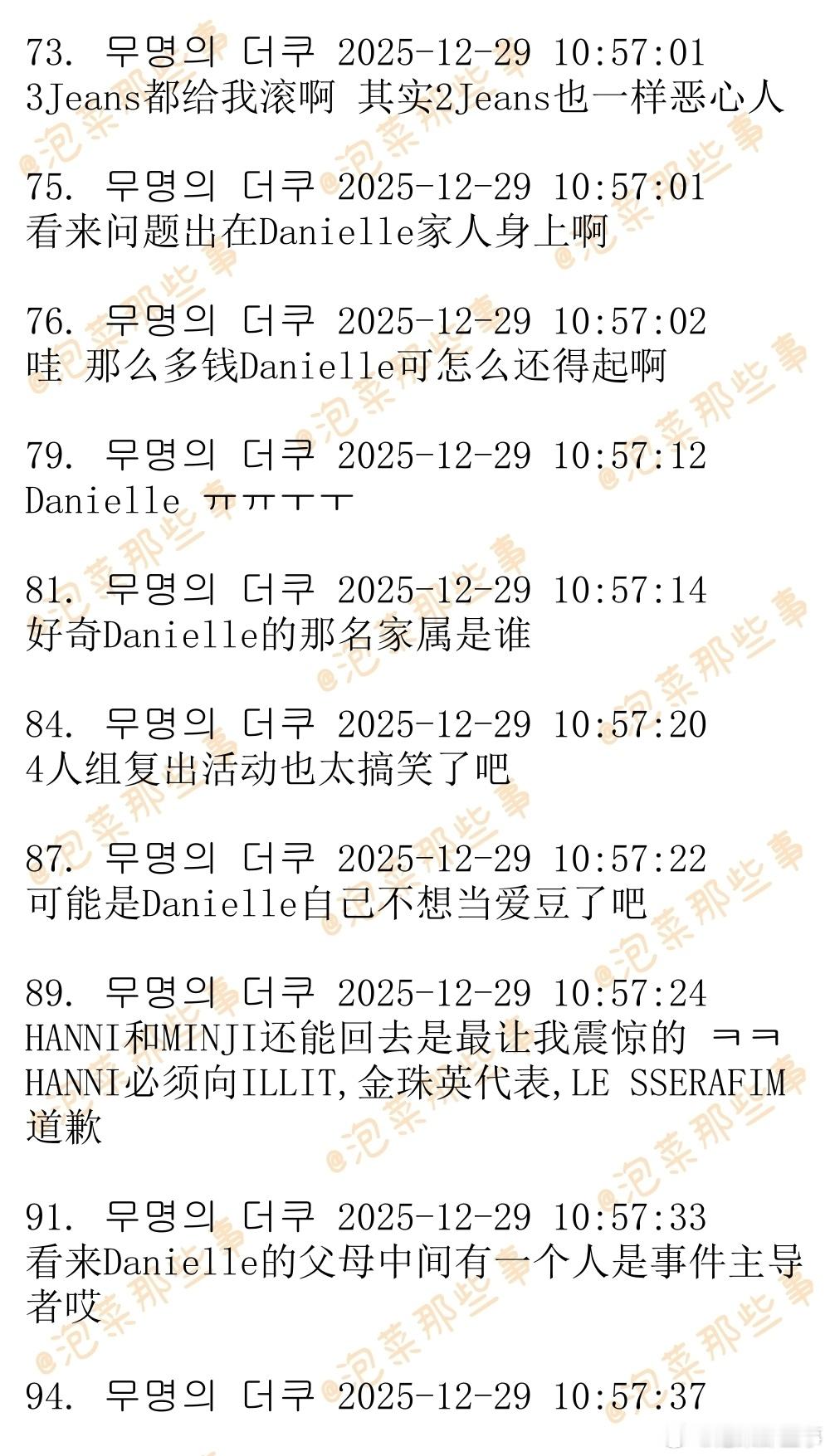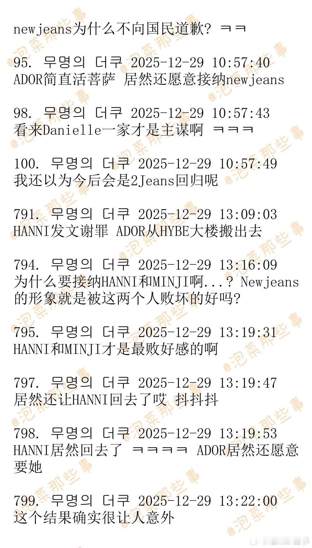 🔥🔥韩网800楼热帖评论翻译🔥🔥HYBE将与Danielle解约Danielle退出newjeans据韩媒报道,ADOR于12月29日发布公告,以“难以继续作为NewJeans成员合作”为由单方面解约Danielle,并表示“Danielle的一名家属及闵熙珍造成了这次纠纷情况,对NewJeans退出ADOR及后续回归ADOR延迟负有重大责任”,将追究法律责任。其他4名成员:Haerin、Hyein已于11月率先回归,Hanni携家属赴韩沟通后确认回归,Minji持续与公司协商中。cr.theqoo