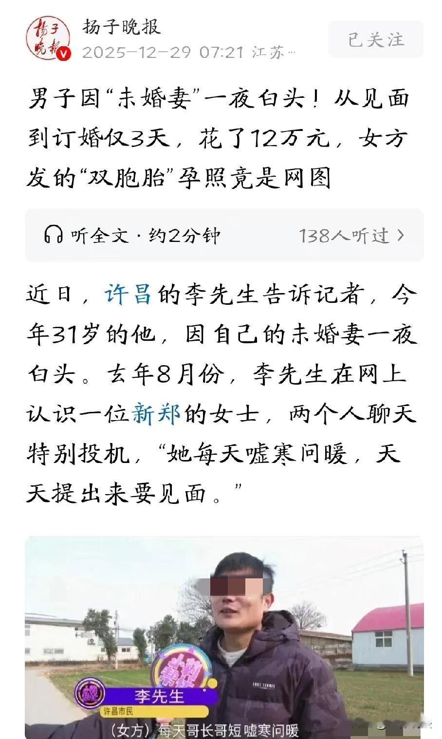 河南许昌,31岁的男子在网上认识一女子,两人相聊甚欢,仅仅两周就急着奔现。更令人惊讶的是,女子第一次见面就提出订婚。男子被爱情冲昏了头脑,见面3天就开开心心举办了订婚宴,还给女子9万元彩礼和3万元金首饰。订婚后,两人聚少离多,还没见几次面,女子突然给男子发来怀孕的图片,而且还以保胎为由要走了5万多元。没过多久,男子意外得知,女子的孕检照片是网图,他找女子讨要说法,这才发现女子用同样的手段在别人那里骗财骗色。男子,为此一夜白头,把女子告上法庭。 31岁的小伙李先生,本以为找到了真爱,步入了婚姻殿堂,结果却把自己坑得倾家荡产,还一夜愁白了头。 去年8月,单身多年的李先生在网上认识了一位新郑女士,对方嘴甜得发齁,每天主动嘘寒问暖,隔着屏幕都透着一股子热情,没聊几天就一个劲儿提着想见面。 李先生本来就盼着能找个伴儿,被这突如其来的温柔攻势冲得晕头转向,只觉得终于遇到了对的人。 两人网聊刚满两周,就约了线下见面。让李先生意想不到的是,刚见第一面,女方就直截了当地提出要订婚。 31岁的年纪,能遇到这么“真心实意”的人,李先生哪儿还顾得上多想,满心都是捡到宝的欢喜。 见面才两三天,他就风风火火办了场订婚宴,不仅给了女方9万元彩礼,还花3万元买了三金首饰,前后一共花了12万,就盼着能早点成家。 可订婚后的日子,跟李先生想象的完全不一样。 女方推脱着说自己忙,两人聚少离多,从订婚到后来起疑,见面次数加起来都没超过10次。 每次李先生想多约几次,女方要么找借口推脱,要么就用甜言蜜语哄着他。 李先生虽然心里有点嘀咕,但架不住对方会说,也就没往深处想。 去年11月,女方突然发来一张孕检照片,喜滋滋地告诉李先生,她怀了双胞胎。 李先生当场乐疯了,本来还觉得见面少有点遗憾,这下满心都是要当爸爸的激动,对女方更是百依百顺。 没过多久,女方又说孕期反应大,需要保胎,前后又从李先生这儿要走了五六万元。 李先生一门心思盼着孩子平安,每次转账都毫不犹豫,还总叮嘱女方好好休息。 可没等多久,女方又突然传来消息,说孩子不幸流产了。 李先生急坏了,想过去照顾她,却被对方以“情绪不好想独处”为由拒绝了。 这一连串的变故让李先生心里犯了嘀咕,他拿着女方发的孕检照片,无意中跟朋友提起。 没想到朋友一眼就看出不对劲,觉得这照片看着非常眼熟,好像曾经见过的一张网图。 李先生赶紧上网一搜,果然找到了这张“双胞胎孕照”的原图,这就是网上流传的素材。 意识到被骗的李先生连夜赶到新郑找女方要说法,可这一去,竟发现了更让他崩溃的秘密。 女方不仅骗了他,还同时跟开封的石先生交往,用的也是同样的套路。 更让人吃惊的是,这位女士早就被列为失信被执行人,专门靠网恋骗财骗色。 石先生跟李先生一聊才发现,两人的遭遇几乎一模一样,而且女方和他们交往的时间还高度重合。 2024年11月22日,女方给李先生发怀孕照;2025年1月29日,她还在给石先生发消息说:谢谢老公,今年是我们在一起的第三年。 得知真相的那一刻,李先生感觉天都塌了。12万彩礼加三金,再加上5万多的“保胎费”,前前后后花了17万多,全打了水漂,自己付出的真心更是成了笑话。 巨大的打击让他一夜白头,曾经的欢喜雀跃全变成了满心的懊悔和愤怒。 随后,李先生和石先生都选择了起诉。法院庭前调解过程中,女方自愿退还李先生14万元,法院也判决女方返还石先生142900元。 虽然退还了大部分的钱,但两人觉得这事儿没这么简单,还是选择报警处理,希望能追究女方的刑事责任。 《刑法》第266条规定:诈骗公私财物,数额较大的,处三年以下有期徒刑、拘役或者管制,并处或者单处罚金;数额巨大或者有其他严重情节的,处三年以上十年以下有期徒刑,并处罚金。 本案中,女子主观上具有非法占有目的,客观上虚构订婚结婚意愿、怀孕保胎、双胞胎流产等事实,还同时与他人交往,使李先生、石先生陷入错误认识并交付财物,累计金额均达数额巨大,构成诈骗罪。 虽然女方退还了这些财物,但这并不影响诈骗罪的成立,积极退赔只能作为减轻处罚的情节,女子这一次只怕在劫难逃。