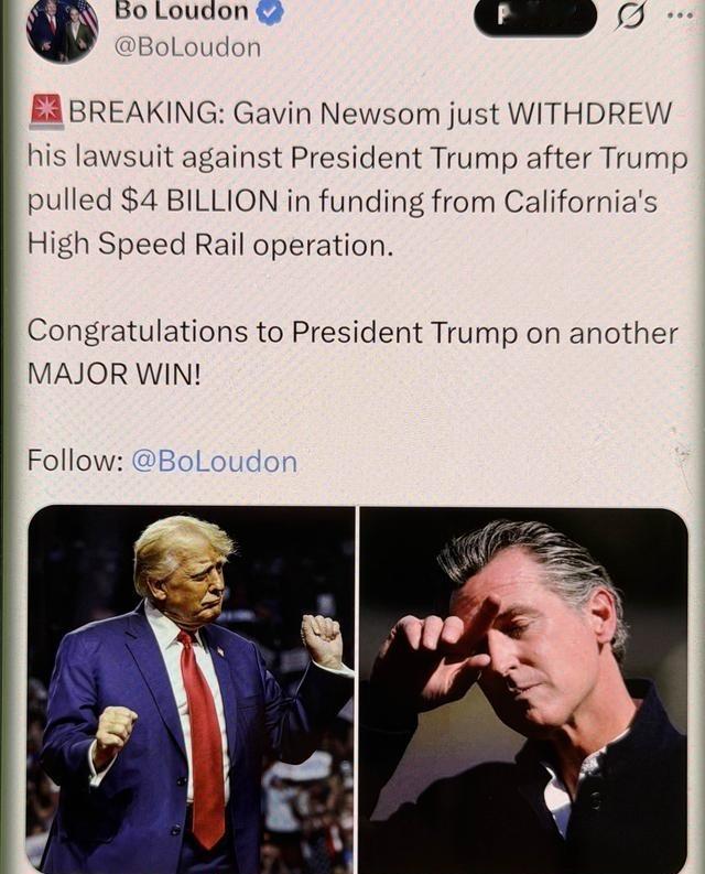 突发消息:在特朗普叫停对加州高铁项目的40亿美元拨款后,加文·纽森随即撤销了对特朗普总统的诉讼。祝贺特朗普总统再添一场重大胜利! 加州高铁这个项目从2008年选民批准就开始了,本来计划建一条从旧金山到洛杉矶的高速铁路,预算330亿美元,预计2020年完工。可到现在17年过去了,花了上百亿美元,还没铺一条正式的高铁轨道,只在中央谷地建了些高架桥和导轨,成本飙到890亿到1280亿美元之间,通车至少推到2033年。很多人早就看不下去,叫它“通往虚无的火车”。 今年夏天,特朗普政府交通部长肖恩·达菲发报告,说加州高铁管理局管理不行,进度拖沓,预算超支严重,没法按时按预算交付。7月16日,直接宣布终止大约40亿美元联邦拨款。这些钱本来是奥巴马和拜登时期批的,现在特朗普上台,直接砍掉。特朗普在社交平台上说,这下纳税人的钱不用再扔进这个无底洞了,可以拿去干点实事儿。达菲也直言,加州这项目就是浪费,联邦资金该支持靠谱的交通计划。 纽森当时火大,马上发声明,说这是政治报复,特朗普针对加州来的,跟事实不符。加州高铁管理局很快在7月起诉联邦交通部和铁路管理局,要求恢复资金。纽森叫这举动是惩罚加州,没道理。 8月,联邦又追加砍了1.75亿美元,涉及几个子项目。加州那边继续建中央谷地段,但资金不确定性大,项目本来就靠州里碳交易收入每年10亿美元撑着,联邦钱只占总支出的18%。 几个月下来,诉讼没啥进展。联邦铁路管理局警告,所有工程款都“有风险”,可能不付钱。加州高铁管理局觉得继续打官司没意思,12月23日,州检察长罗布·邦塔提交撤诉通知,正式放弃诉讼。管理局发言人说,联邦政府不是可靠伙伴,不值得信任,干脆自己干,不靠他们了。 他们现在转向找私人投资者,12月19日就发资格请求,打算2026年夏天选合作伙伴,开发站区地产啥的,挣点额外钱。州里9月通过法案,确保碳交易资金每年10亿美元到2045年,项目不会停工。中央谷地已经建了50多座主要结构,近80英里导轨,继续推进。 特朗普这边省下纳税人钱,转去支持全国其他铁路和道路项目。达菲说,这钱该花在能改善乘客和司机生活的实处。整个事儿就这么结束了,加州认了联邦不给钱的事实,自己想办法往前推。特朗普政府成功止损,这场资金拉锯战,以加州撤诉收场。