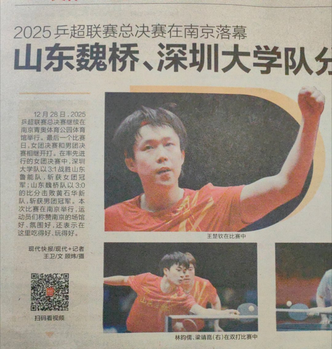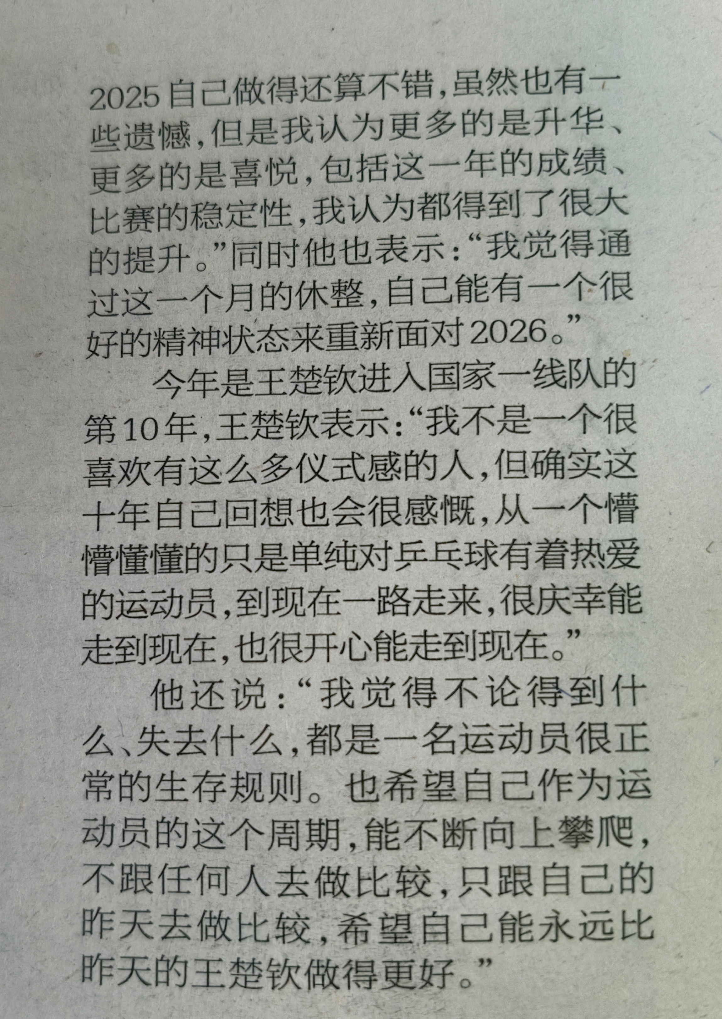王楚钦 登机时在现代快报上发现楚钦好萌的耶毛看到了昨天的赛后新闻发布会采访:“我觉得整个2025自己做得还算不错,虽然也有一些遗憾,但是我认为更多的是升华、更多的是喜悦,包括这一年的成绩、比赛的稳定性,我认为都得到了很大的提升。"同时他也表示:"我觉得通过这一个月的休整,自己能有一个很好的精神状态来重新面对2026。"今年是王楚钦进入国家一线队的第10年,王楚钦表示:"我不是一个很喜欢有这么多仪式感的人,但确实这十年自己回想也会很感慨,从一个懵懵懂懂的只是单纯对乒乓球有着热爱的运动员,到现在一路走来,很庆幸能走到现在,也很开心能走到现在。"他还说:"我觉得不论得到什么、失去什么,都是一名运动员很正常的生存规则。也希望自己作为运动员的这个周期,能不断向上攀爬,不跟任何人去做比较,只跟自己的昨天去做比较,希望自己能永远比昨天的王楚钦做得更好。" 支持楚钦,走自己的路,攀自己的峰,只和昨天的自己比🤟🏻未来握在自己手里,由自己定义
