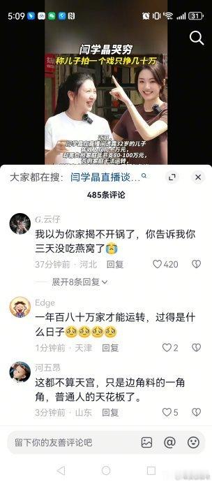 演员闫学晶哭穷引争议最近,演员闫学晶哭穷一事在网络上引发了轩然大波,成为了大家茶余饭后热议的话题。这就好比平静的湖面突然被扔进了一块大石头,激起了层层涟漪。闫学晶,大家都不陌生,她在演艺界有着颇高的知名度。她出演过众多经典的影视作品,塑造了一个个鲜活的人物形象,给观众们留下了深刻的印象。就拿她在一些农村题材电视剧中的表现来说,那演技简直是杠杠的,把角色的性格特点诠释得淋漓尽致。按理说,这样一位有实力、有作品的演员,应该是名利双收才对。然而,她却公开表达自己经济上的困境,这可让网友们炸开了锅。有人觉得,演员们赚得盆满钵满,哭穷就是在作秀。毕竟,在大众的认知里,演艺圈可是个 “吸金” 的地方。据相关数据显示,一些一线演员一部戏的片酬就能达到几千万甚至上亿。在这样的大环境下,闫学晶说自己没钱,难免会让人觉得难以理解。但换个角度想,每个人都有自己的难处。也许闫学晶真的遇到了经济上的问题,比如投资失败、家庭支出过大等等。就像我们普通人一样,有时候也会因为一些突发情况而陷入经济困境。专家也说过,不能仅仅根据职业来判断一个人的经济状况,每个人的财务情况都是复杂多变的。这件事也反映出了社会上一种普遍的心态,那就是大家对明星的要求往往比较高。明星们在享受着高关注度和高收入的同时,也承受着巨大的舆论压力。一旦他们的言行与大众的认知不符,就很容易引发争议。从这件事我们也能得到一些启示。对于明星来说,在公众场合发言要更加谨慎,避免引起不必要的误解。而对于我们普通人来说,也应该学会换位思考,不要轻易地对别人进行指责和评判。毕竟,我们看到的只是表面现象,每个人背后都有不为人知的故事。闫学晶哭穷这件事,就像是一面镜子,折射出了娱乐圈和社会的种种现象。它让我们在茶余饭后的讨论中,也能多一些思考,多一些理解。至于闫学晶到底是真穷还是假哭,也许只有她自己最清楚。但无论如何,我们都应该以一种理性和包容的态度去看待这件事。