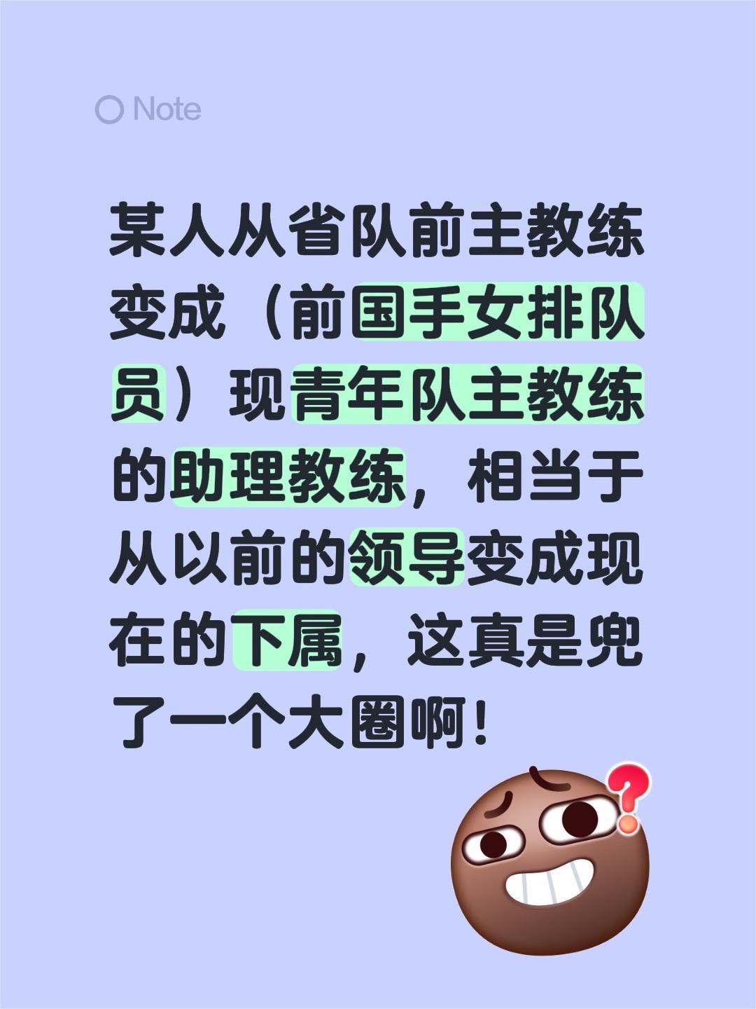 某人从省队前主教练变成(前国手女排队员)现青年队主教练的助理教练,相当于从以前的领导变成现在的下属,这真是兜了一个大圈啊!