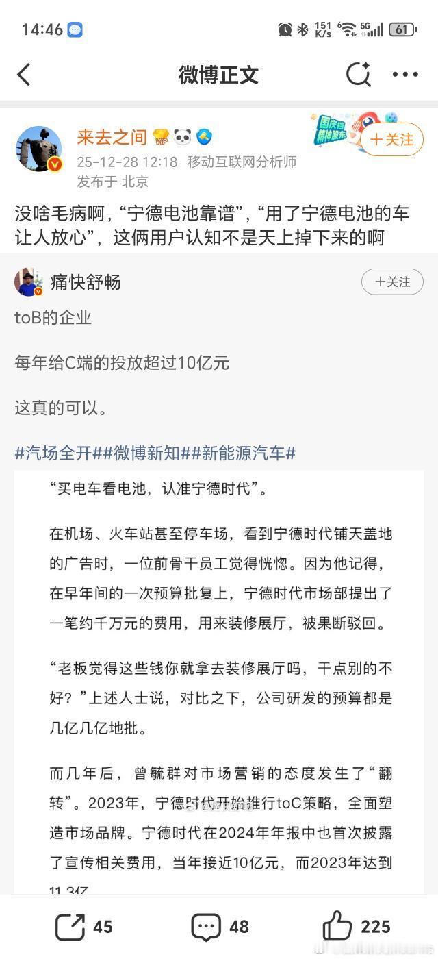确实不是天上掉下来的,这不谜底就在谜面上了。讲真,电池这种东西,你不打广告,消费者可能一辈子都不知道车里用了什么。就像油车时代,博世那么牛逼,你问普通消费者几个知道博世的?有些目标,必须就得下本才行。其他供应商们,学会了吗?