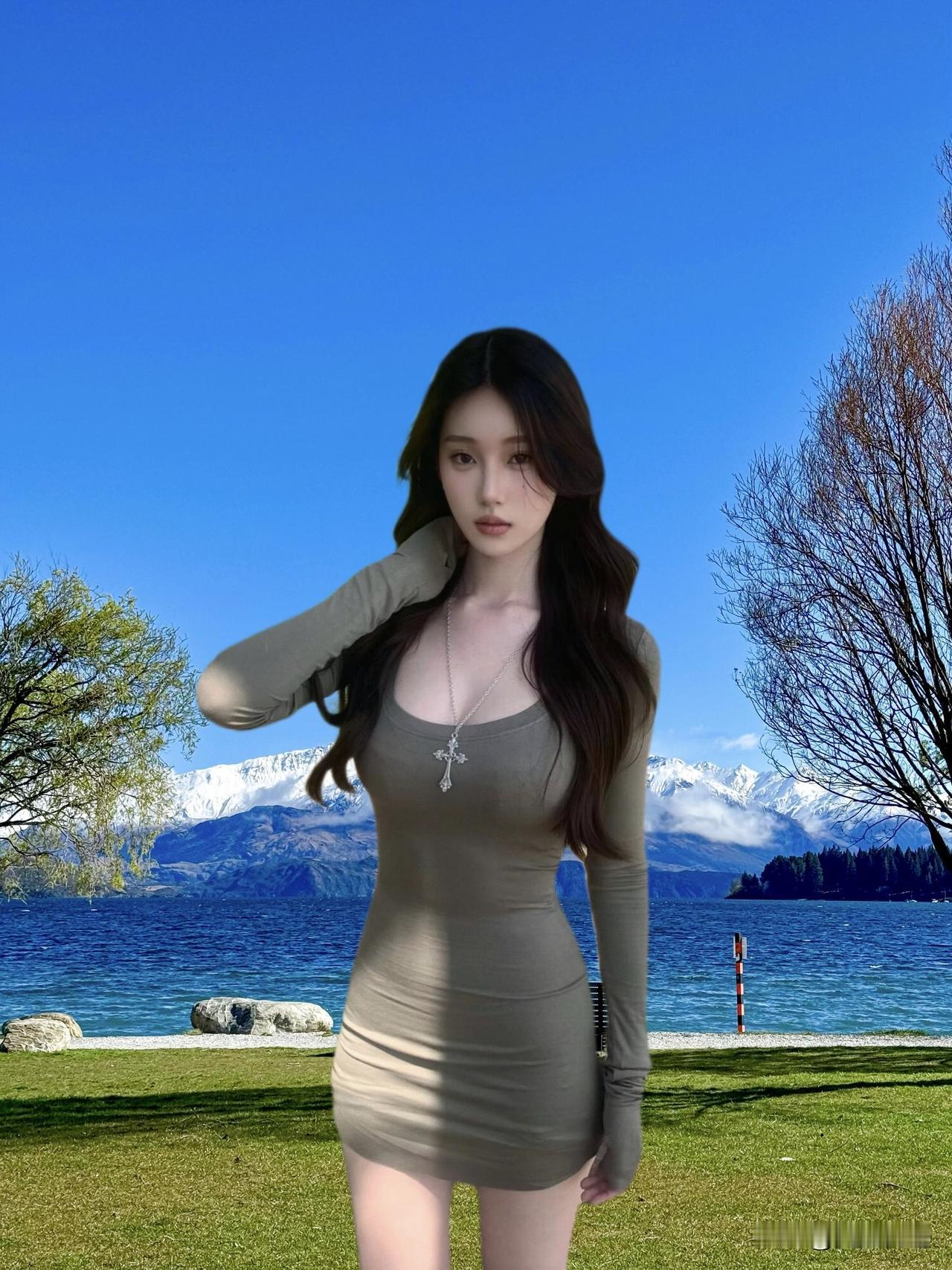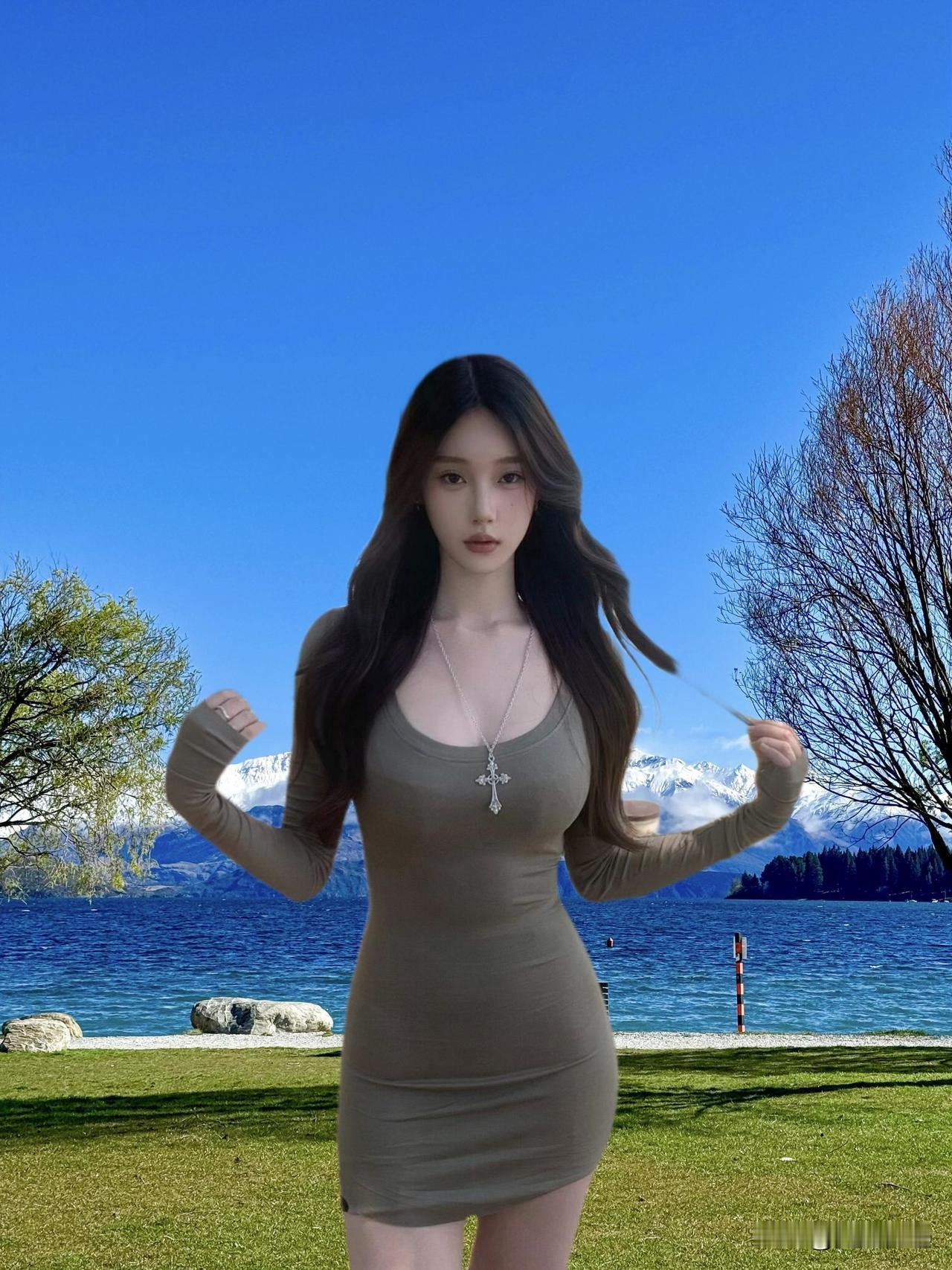 湖畔绿意盎然,少女漫步其中,享受宁静时光。