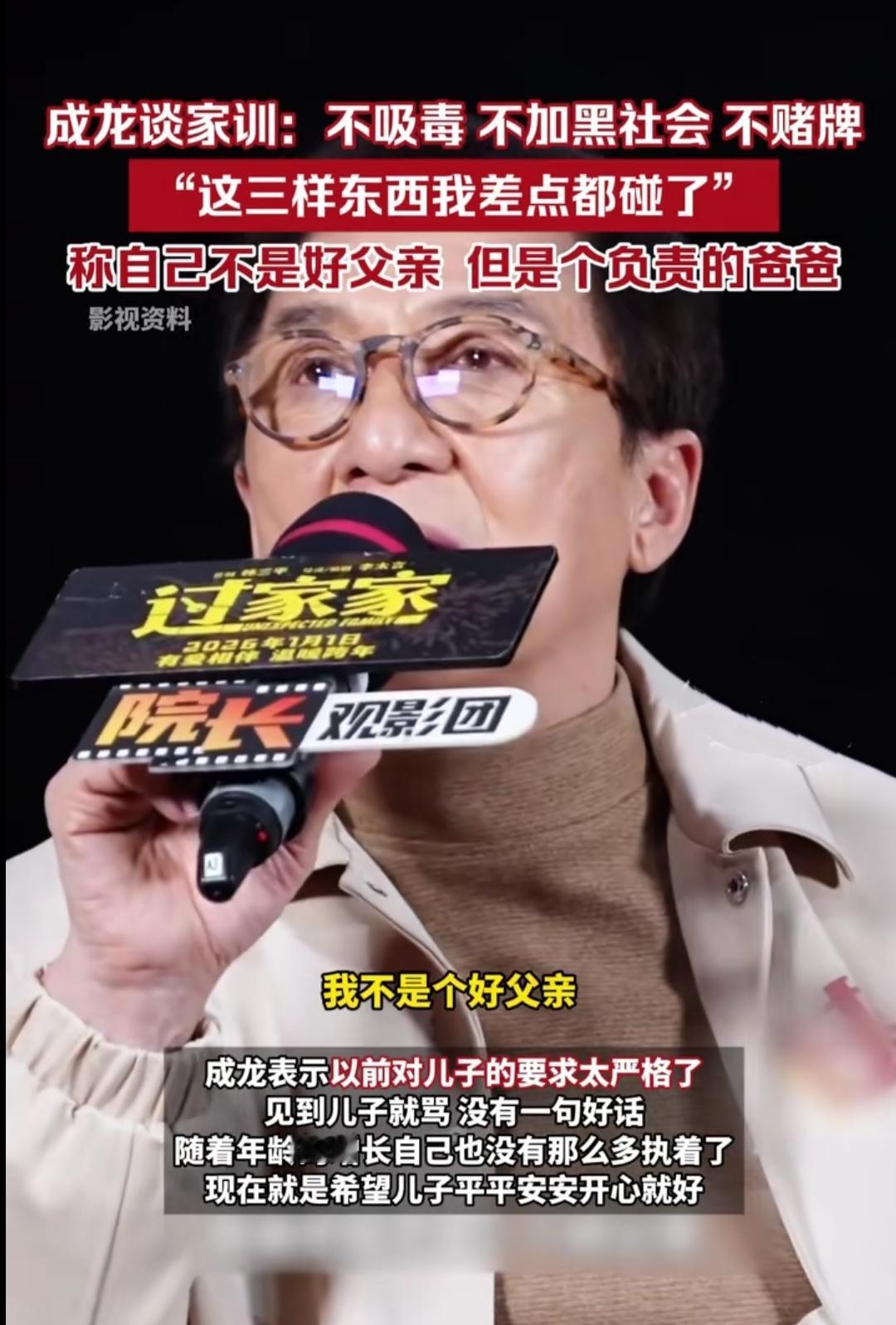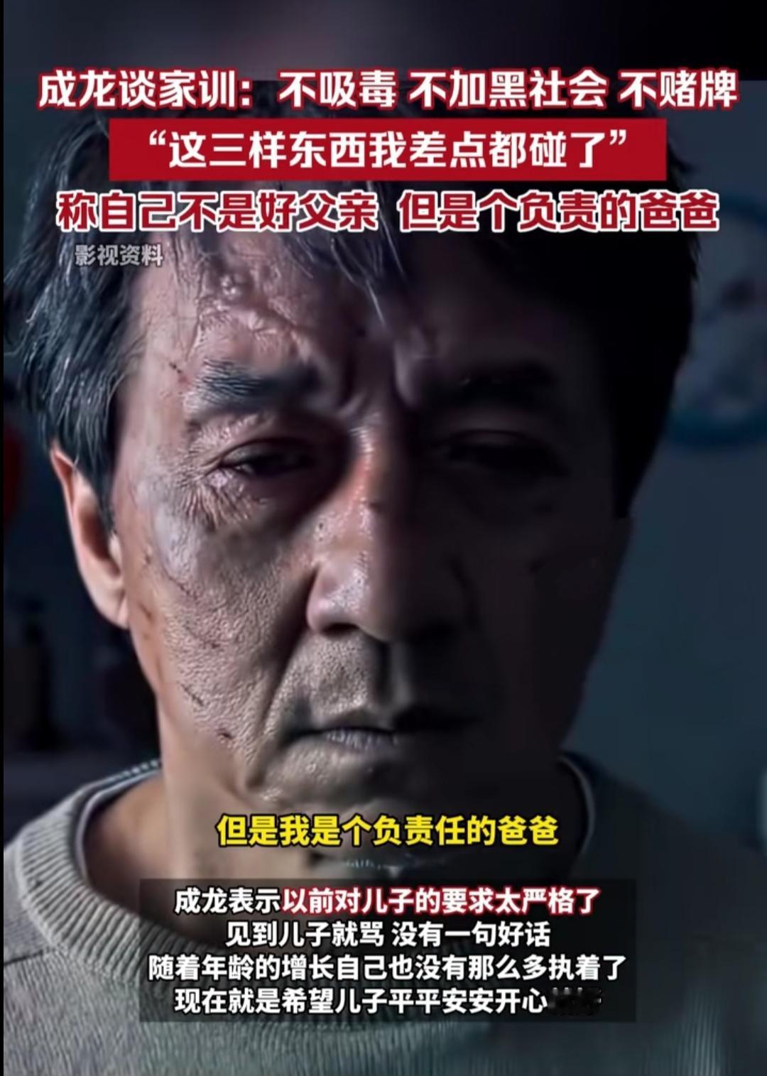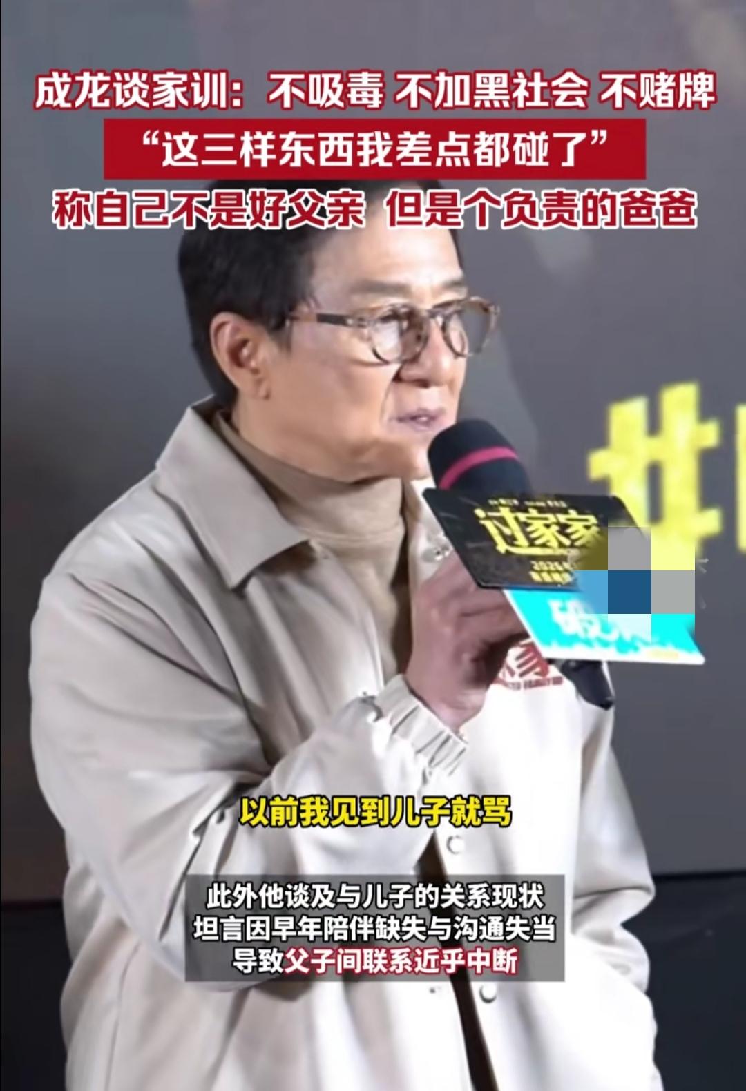 听到成龙说“我不是个好父亲,但我是个负责任的爸爸”,心里瞬间五味杂陈。这个在影坛摔打半生的硬汉,谈起儿子时满眼愧疚,早年见面就骂、没一句好话,陪伴的缺失让父子联系几乎中断,可他的爱,从来都藏在笨拙的严苛里。 他曾差点踩进吸毒、涉黑、赌牌的泥潭,是父亲的三条家训把他拉回正途,便想把这份“保命底线”用最硬的方式传给儿子。忙着拍电影的那些年,他用指责代替沟通,用规矩掩盖牵挂,总怕孩子走自己差点走错的路,却忘了孩子更需要的是陪伴而非苛责。 如今71岁的他终于松了口,只盼儿子平安开心就好。这大概就是中国式父亲的缩影:爱得深沉却不懂表达,用最笨拙的方式护佑孩子,等岁月磨平棱角,才懂父爱从不是冰冷的规矩,而是温热的接纳。我们总在追悔中学会爱,只愿这份醒悟,不算太迟。