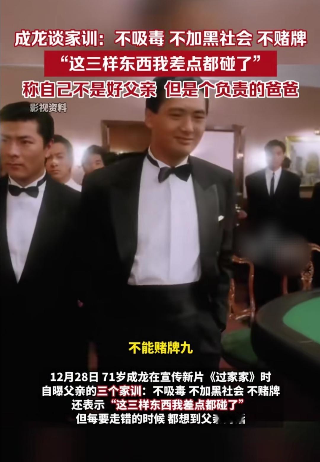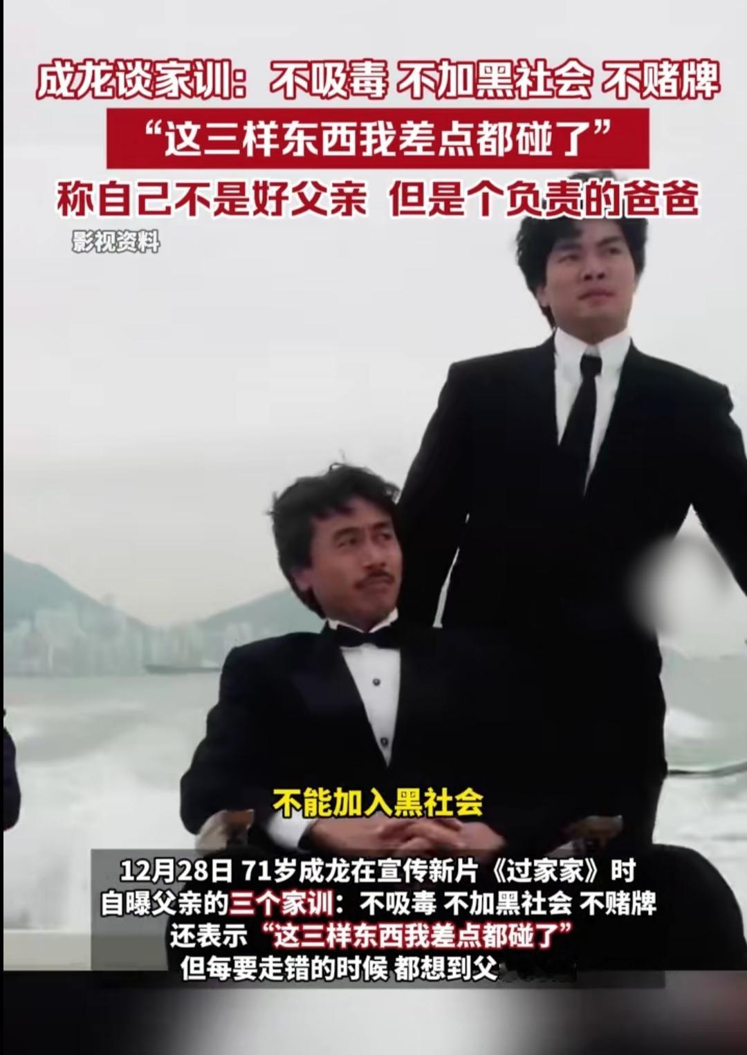 刚刷到成龙在《过家家》首映礼谈父亲的家训,瞬间绷不住了。这个打了一辈子、摔了一辈子的硬汉,轻描淡写说“不吸毒、不加黑社会、不赌牌这三样,我当年差点都碰了”——早年香港演艺圈鱼龙混杂,赌牌、涉黑诱惑绕不开,他全靠父亲这三句糙话,在快踩空时刹住了车。 以前总觉得他是天生的“清醒者”,现在才懂:哪有什么天生的定力?不过是有人在你年少时,把最朴素的底线钉进了心里。他说自己“不是好父亲”,却把这三条规矩死扣在儿子身上,哪怕对房祖名早年严苛,也是怕他走了自己差点踩歪的路。 那些听着土气的家训,哪里是规矩?是风浪里的锚,是走错路时的回头箭。71岁的他谈这些,像说别人的故事,可眼底的认真骗不了人——有些底线守一辈子,才撑得起这摔打半生的人生。