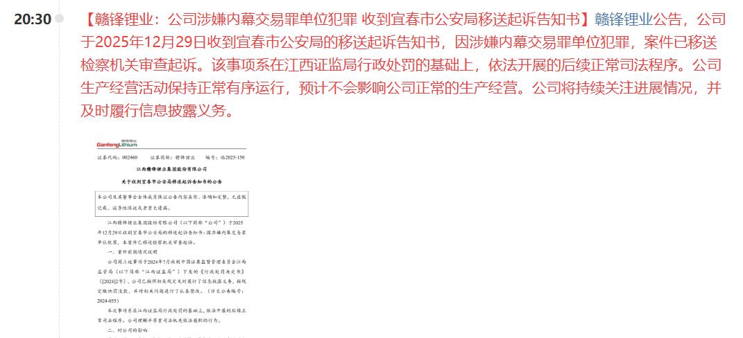 完犊子!明天锂矿股估计又得一击了? 刚刚碳酸锂巨头赣锋锂业发布公告,称公司于2025年12月29日收到宜春市公安局的移送起诉告知书,因涉嫌内幕交易罪单位犯罪,案件已移送检察机关审查起诉。 估计里面的股东看到这个消息,估计是难眠的一晚了! 涉嫌内幕交易单位犯罪,这就是触犯刑法了,这对于公司而言必然是一个重大利空。 赣锋锂业作为碳酸锂两大巨头之一,此时,在宁德时代等下游喊话降温的形势下,又来这一个利空,明天大幅低开估计是大概率事件了。 如果赣锋锂业跌倒,难免会给整个产业链个股造成压力。 近期碳酸锂价格涨疯了,明显是有点过头了,严重脱离了基本面。 下游车企本来车子就不好卖,如果按崔东树的判断,2026年一季度电车销量将环比大幅下降。 现在上游原材料价格这么暴涨,消费者又不买单,这个价格给谁呢?