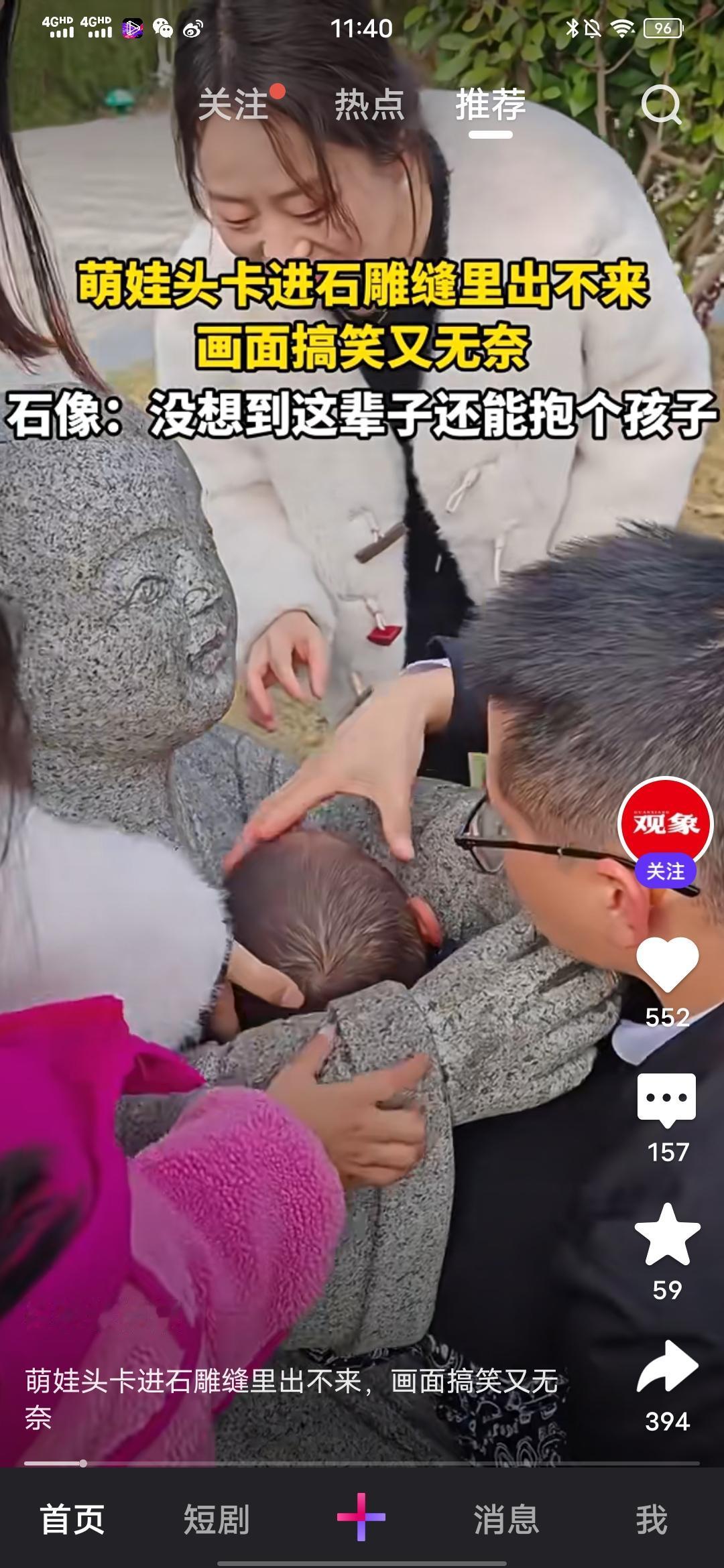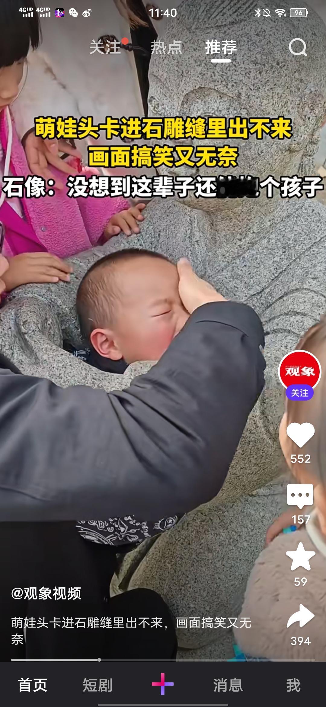 萌娃头卡进石雕缝里出不来,画面搞笑又无奈! 这是观象视频发布的消息,这个事情发生在近日贵州,从视频看,一个萌娃从下往上钻进石雕像怀里,结果出不来了,头卡在石雕缝怀中间,大人在帮忙把他头往下按,但是左右就是出来,萌娃也紧张得吓哭了。网友以石像的口吻调侃说,没想到这辈子还能抱个孩子。 其实,只要进的去,就出得来,只是孩子一紧张,一害怕就着急了,找到开始时钻进去的角度,肯定是能出来的,所以,遇到类似情况,先稳定孩子的情绪,让他冷静下来,安抚他,告诉他不着急,爸爸妈妈会一直陪着他,会等他出来,慢慢来,一定可以出来的。 当然最重要的还是把孩子看紧点,最好不要有这些行为,教会给孩子这些安全常识。 新的一年马上要来了,又是大家放假带娃出游的时间要来了,带娃的大家都细心些,照看好自己的孩子,愿大家都平安!