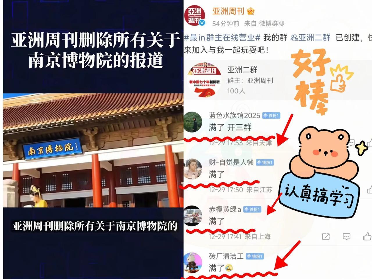 这亚洲周刊, 是要干大事了吗? 突然创了群,不到一小时就满员了,评论区全是求再开群的声音,妥妥有种“不让公开发,那就群里发,真相必须公开”的架势,太刚了吧! 如今建群之举,可见其坚持探寻真相的决心。这种不向压力低头的态度,值得点赞! 不得不说亚洲周刊是真刚啊,很喜欢! 你觉得亚洲周刊后续能成功公开更多真相吗?