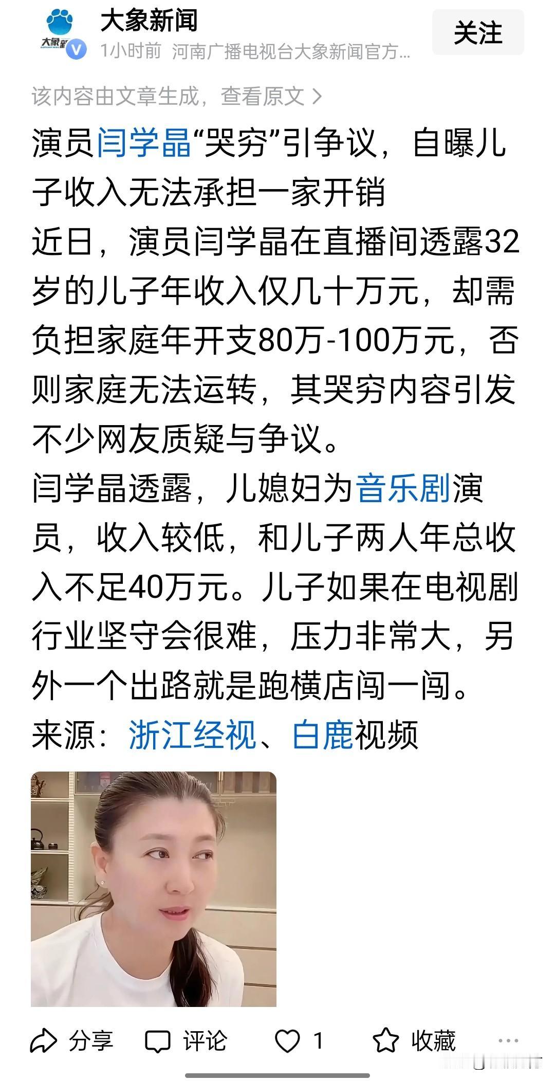 演员闫学晶在直播中替儿子一家“哭穷”让许多网友心生不平,更有网友要闫学晶应该道歉。 老实说一年百八十万的家庭支出确实超过了绝大多数的中国家庭,也让我有些嫉妒。但是,别人自家赚钱自己家花,让人道歉该怎么道呢?要说自己不小心“哭穷式露富”了?[笑哭] 也许有人会说那么有钱了不该再直播割韭菜,但是这个行业本是个正当行业,商家、主播、买家名取所需,有人比闫学晶赚得更多,“家人们”买得还挺开心。
