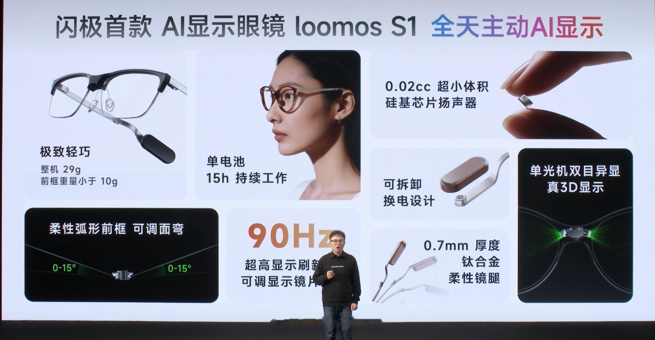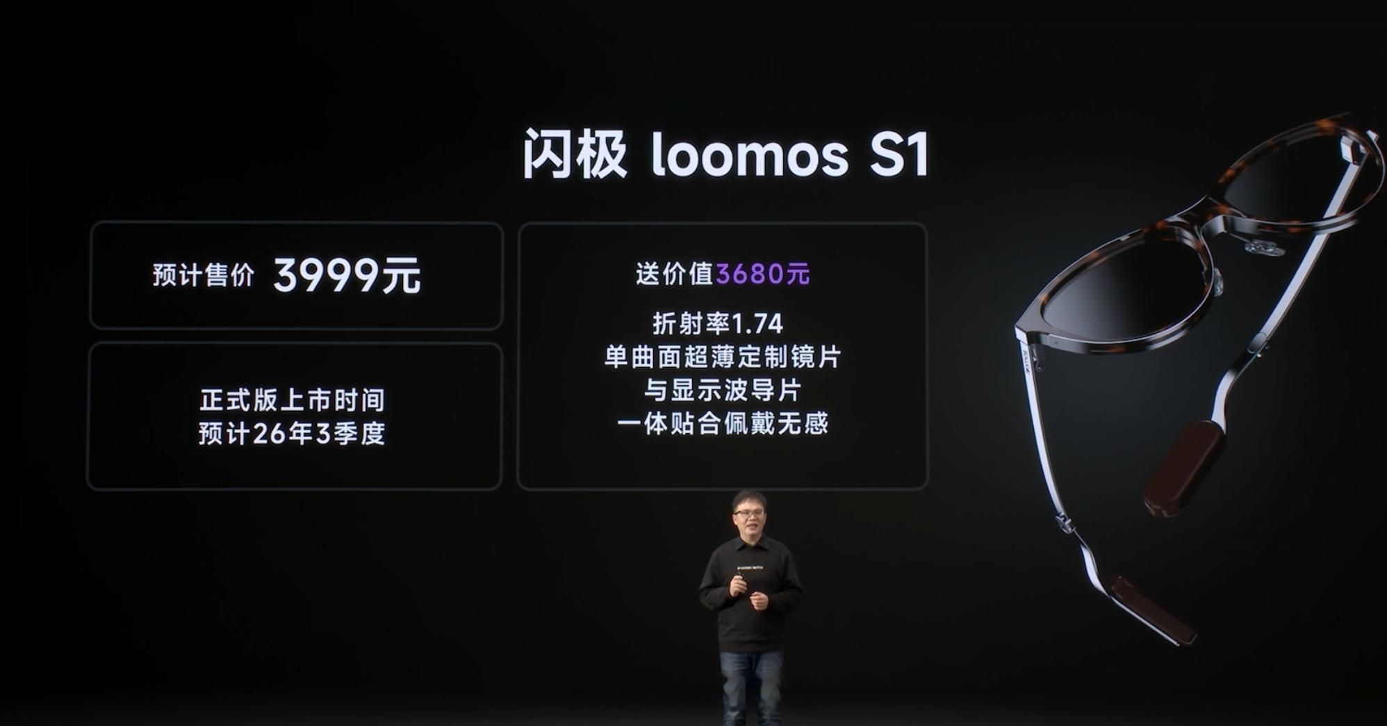 闪极 loomos Al 拍摄眼镜 L1,258mAh 可换电池+多功能换电仓,1200 万像素摄像头,全天候主动 AI 录制,预约价 2999 元起,A1 老用户补贴 1000 元。闪极首款 AI 显示眼镜 loomos S1,整机 29g,前框重量小于 10g,最长续航 15 小时,预计售价 3999 元,明年 3 季度上市。