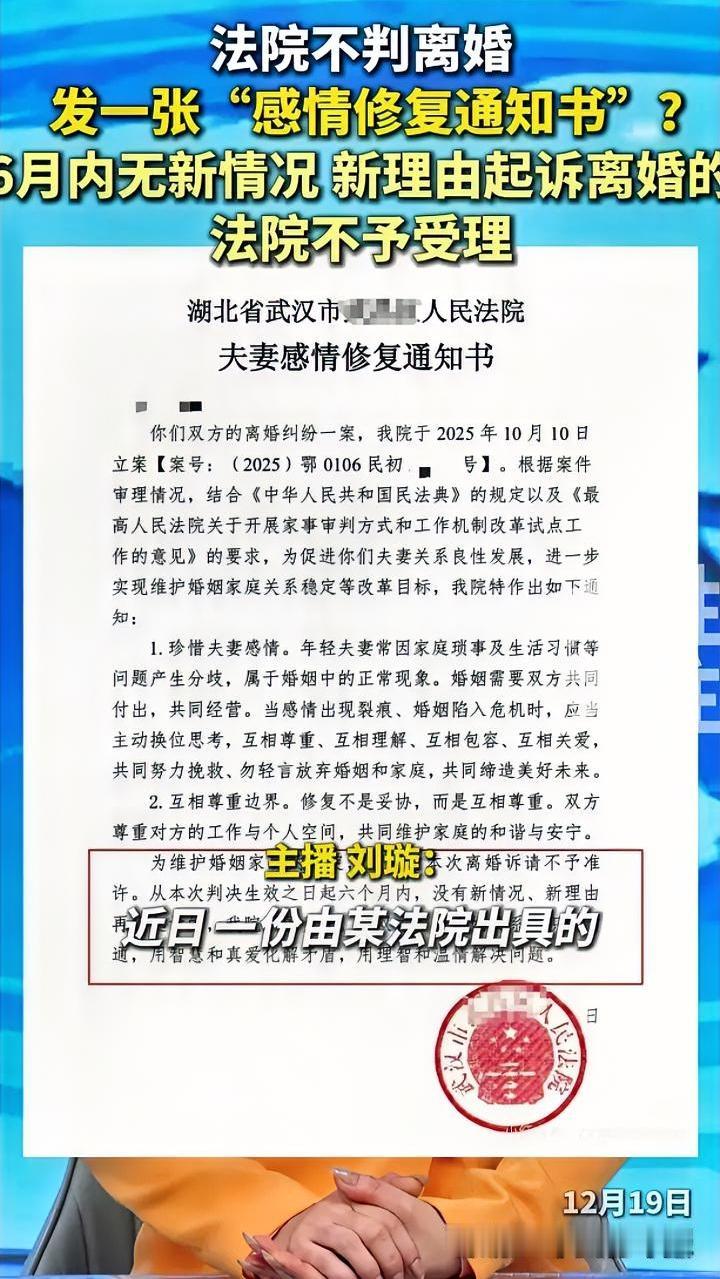 离婚去法院,结果判了个“6个月内不准离婚”,结婚时好好的,离婚离不成了? 近期湖北某法院一张“夫妻感情修复通知书”火了,一对夫妻去法院起诉离婚,法院认为夫妻俩都是生活上的小事产生分歧,还没到离婚的地步,所以出具了这份材料,让俩人回家冷静冷静。 可以看得出,现在离婚不仅是两个人的事了,连法院都当起了“劝客”,也确实该劝一劝,结婚的时候克服了一切困难,如果因为琐事离了婚,那就太可惜了。也没准这半年俩人再磨合磨合,最后就不打算离婚了。
