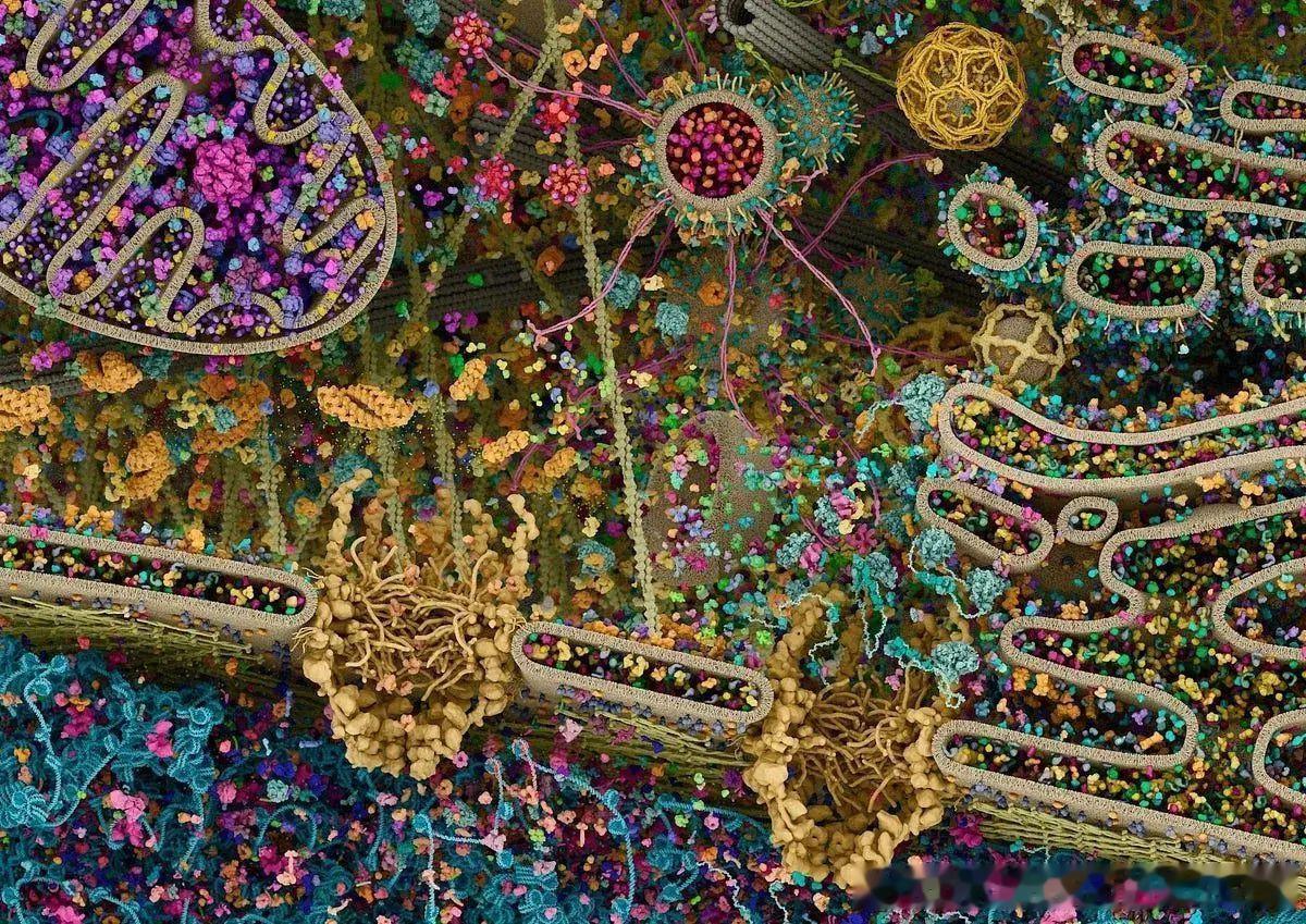 迄今为止最详细的人类细胞图像,一个名为“真核细胞景观”(Cellular Landscape)的3D渲染模型,由科学动画师Evan Ingersoll和哈佛医学院分子可视化教授Gaël McGill博士共同创作。这张图并非真实照片(因为分子尺度小于可见光波长,无法直接拍摄),而是通过整合多种结构生物学数据建模而成的数字模型。其中X射线晶体衍射用于确定蛋白质等大分子的精确原子坐标。核磁共振 (NMR) 补充分子在溶液中的动态结构信息。冷冻电子显微镜 (Cryo-EM) 提供大型多亚基复合物的高分辨率三维结构。