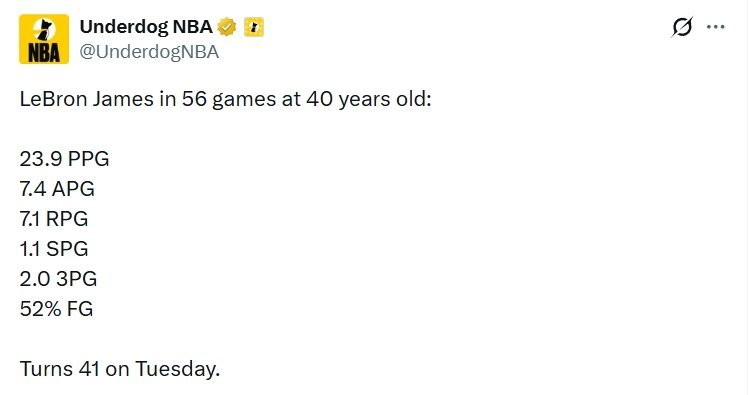 老头还能打!詹姆斯40岁数据:场均23.9分7.1板7.4助1.1抢断,场均2记三分,投篮命中率52%!詹姆斯今天扣爽了