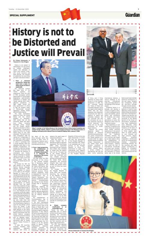 【史不容改,理自昭明】2025年12月23日,驻坦桑尼亚大使陈明健在坦桑尼亚主流媒体《卫报》发表署名文章《史不容改,理自昭明》,全文如下:历史从不允许含糊其辞,正义更不容蓄意挑战。台湾自古属于中国,历史经纬清晰,法理事实清楚。任何歪曲事实、企图质疑和破坏一个中国原则的行径都将以失败告终。一、以史为凭,台湾是中国的一部分不容置疑也不容改变台湾问题的历史经纬和法理事实十分清晰。🔻自1335年起,中国历代中央政府就开始在澎湖、台湾设治,实施行政管辖。1895年,日本通过侵略战争迫使中国清政府签订不平等条约《马关条约》,非法侵占台湾及澎湖列岛。🔻1943年12月,中美英三国政府发表《开罗宣言》,宣布三国之宗旨在使日本所窃取于中国之领土,例如东北、台湾、澎湖列岛等,归还中国。🔻1945年7月,中美英三国共同签署、后来苏联参加的《波茨坦公告》,重申“开罗宣言之条件必将实施”。同年9月,日本签署投降书,明确承诺“忠诚履行波茨坦公告各项规定之义务”。🔻10月25日,中国政府宣告“恢复对台湾行使主权”,并在台北举行“中国战区台湾省受降仪式”。至此,中国从法律和事实上收复了台湾。🔻1971年10月25日,第26届联合国大会通过第2758号决议,驱逐了台湾当局的代表,恢复了中华人民共和国政府在联合国的席位和一切合法权利。这一决议不仅从政治上、法律上和程序上彻底解决了包括台湾在内全中国在联合国的代表权问题,而且明确了中国在联合国的席位只有一个,不存在“两个中国”、“一中一台”的问题。联合国秘书处法律事务办公室官方法律意见明确指出,“台湾作为中国的一个省没有独立地位”。实践中,联合国对台湾的称谓是“台湾,中国的省(Taiwan, Province of China)”。截至目前,包括坦桑尼亚在内的183个国家与中华人民共和国建立了外交关系,均支持中国政府在台湾问题上的原则立场。一个中国原则成为国际社会的普遍共识,是遵守国际关系基本准则的应有之义。二、以法固史,设立“台湾光复纪念日”维护二战胜利成果今年是中国人民抗日战争暨世界反法西斯战争胜利80周年,也是台湾光复80周年。站在这一重要历史节点,中国全国人大常委会决定将每年10月25日确定为“台湾光复纪念日”,这是继中国人民抗日战争胜利纪念日和南京大屠杀死难者国家公祭日后,设立的又一个抗战主题的国家级纪念日,这既符合国际惯常做法,更是对正确二战史观与抗战史观的坚决维护。设立台湾光复纪念日,充分体现了人民的意愿和国家的意志,彰显了两岸同属一个中国的历史和法理事实,宣示了全国各族人民反对“台独”分裂、推动两岸关系和平发展、推进祖国统一大业的坚强决心。🔻抗战胜利后,国民党统治集团发动内战,失败后退踞台湾,受到美国扶持。台湾问题由此产生并遗留至今。虽然海峡两岸长期政治对立,但中国主权和领土从未分割,台湾是中国一部分的地位从未改变。1949年10月1日,中华人民共和国中央人民政府宣告成立,取代中华民国政府成为代表全中国的唯一合法政府。这是在中国这一国际法主体没有发生变化情况下的政权更替,中国的主权和固有疆域没有改变,中华人民共和国政府理所当然地完全享有和行使全中国的主权,包括对台湾的主权。三、以正压邪,中国完全统一进程不可阻挡台湾自古以来就是中国领土不可分割的一部分。恪守一个中国原则,是日本等国家必须严格履行的政治承诺和不容推卸的国际法义务。🔻1972年《中日联合声明》明确,“日本国政府承认中华人民共和国政府是中国的唯一合法政府”,“中华人民共和国政府重申:台湾是中华人民共和国领土不可分割的一部分。日本国政府充分理解和尊重中国政府的这一立场,并坚持遵循波茨坦公告第八条的立场”。🔻1978年,中日签订《和平友好条约》,明确指出“《中日联合声明》是两国间和平友好关系的基础,联合声明所表明的各项原则应予严格遵守”,为中日关系确立了法律规范。🔻但日本现职领导人却罔顾历史事实和国际法依据,公然声称台湾问题关系日本“存亡危机”,暗示将武力介入台海问题。有关言论严重干涉中国内政,严重违背国际法和国际关系基本准则,严重破坏战后国际秩序,严重伤害中国人民情感。忘记历史就意味着背叛,甚至还可能重蹈覆辙。为了维护世界和平稳定和人类正义良知,给下一代创造美好未来,这一危险苗头必须得到遏制。前事不忘,后事之师。中坦两国都有追求国家独立的相似经历,中坦传统友谊由两国老一辈领导人缔造。建交六十多年来,中坦关系历经国际风云变幻考验,历久弥坚。坦方坚定支持中国恢复在联合国的合法席位,并为之作出不可磨灭的历史贡献。坦方以实际行动一以贯之地践行一个中国原则。新时代,在元首外交引领下,中坦关系始终保持高水平发展,坦桑尼亚成为中非合作论坛北京峰会成果落地见效最多的国家之一。中国愿继续同坦桑尼亚一道,在一个中国原则的基础上,继续坚定支持彼此核心利益和重大关切,深化互利合作,不断丰富两国全面战略合作伙伴关系内涵,为构建高水平中非命运共同体作出更大贡献。