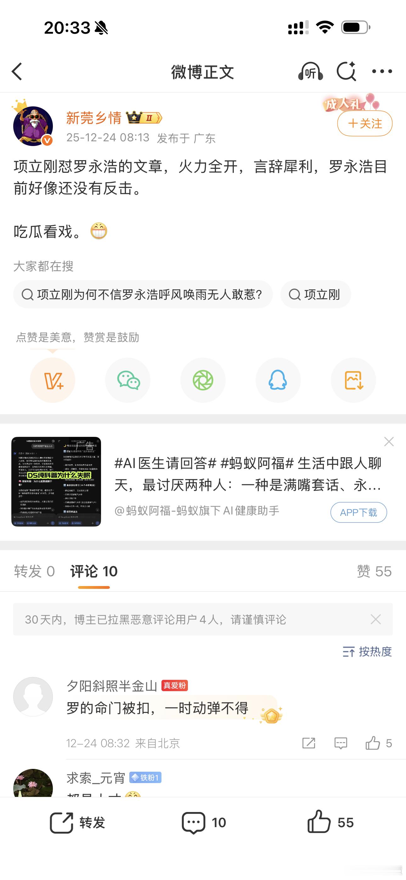 罗项之争,一些吃瓜群众真是看热闹不嫌事大!都急不可耐了!估计项立刚第四篇文章是猛料重磅;罗永浩30号晚科技春晚结束后,重锤必然砸出,就看是火花四溅,还是砸在棉花上?