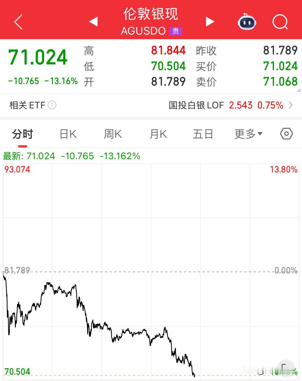 一晚要爆多少仓,要埋多少人,一天跌了10美元,暴跌13%,从81美元到70美元只需一天,这就是今天白银摆在我们面前的走势,已经不能用剧烈波动来形容,崩盘了