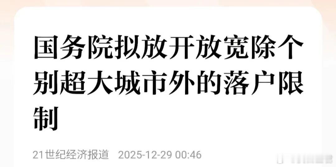 官宣!600多座城市,要放开落户了户籍门槛,正在批量“消失”。0190%以上城市,都要放开落户。据报道,国务院拟放开放宽除个别超大城市外的落户限制,推动转移人口社保、住房保障、教育享有同等权利。这意味着,除“个别超大城市“之外,几乎所有城市都要放开落户限制,“零门槛落户”即将遍地开花。根据《中国统计年鉴2025》,我国共有600多座城市,涵盖直辖市、副省级市、地级市、县级市,而县城则不属于城市。按照城区人口规模不同,可分为“超大-特大-大-中小城市”,超大城市涵盖北上广深成渝津杭等地。目前,省会之外的一般大城市和中小城市,早已是“裸奔“状态,户籍门槛几乎不复存在。正如国务院报告所强调的,城区常住人口300万以下城市落户限制基本取消。山东大学张吉鹏团队在《经济学(季刊)》发布的论文,也通过量化分析得出类似的结论:全国落户门槛加权均值从1999年的98.8%下降到了2024年的12.6%。总体来看,三四五线城市户籍门槛不足10%,48.49%的城市实现零门槛,17个省份全域低门槛。当普通地级市、县级市户籍门槛不复存在,下一步就轮到二线弱省会和非省会经济强市了。02“个别超大城市”,都有谁? 新一轮户籍松绑,放开为原则,不放开为例外,被排除在外的只有“个别超大城市”。衡量城市大小,看的不是全市人口,而是城区人口。城区人口超过1000万的被视为超大城市,500-1000万的为特大城市,300-500万的I型大城市,以此类推。作为城镇规模的金字塔尖,超大城市只有10座:北京、上海、广州、深圳、重庆、成都、天津、武汉、杭州、东莞。虽然同为超大城市,但人口基数存在差异,经济、人口、资源承载力有别,户口含金量大相径庭。根据相关规划和政策精神,无论其他城市如何松绑,京沪都是最后的堡垒,广深津其次,杭州再其次,成都、重庆、武汉、东莞则相对宽松。这与《经济学(季刊)》论文的结论基本一致,落户门槛仍高于50%的只剩下9座:北京、上海、广州、深圳、天津、厦门、苏州、杭州、中山。由于研究周期存在一定滞后,目前中山已基本放开落户,厦门租房也可落户,真正高门槛的所剩无几。落户门槛越来越低,足以说明户口含金量越来越低,绝大多数城市的户口都将失去价值。03北上广深津,何以成了例外?落户门槛之高,京沪独占一档,广深津其次,苏杭等地再其次。京沪落户门槛最严,也说明其户口含金量独一无二,远非其他城市可比。要知道,哪怕是广深,大专生也能直接落户。但在京沪,哪怕是硕士博士,也要受到“进京指标”或“积分落户”的制约。京沪之所以最严,核心原因在于,户口背后附着了教育、医疗、养老、住房等福利,仅高考录取率就足以让无数人趋之若鹜。同时,京沪已基本逼近人口天花板,北京以2300万目标,上海则是2500万,增长空间所剩无几。早在10多年前,京沪就已不追求人口增长,反而率先推动“减量发展”,主动遏制人口流入。可以看到,最近几年,京沪人口罕见负增长,而广深等其他一二线城市仍在保持增长。广州、深圳、天津为第二档,广深是城市地位的体现,天津主要得益于其高考优势。在广深,只有大学生及高技能人才,才有无条件落户资格,一般外来人员落户,只能通过积分入户。深圳积分落户名额每年只有1.5万个,非户籍人口超过1100万,近年入围最低分都在300分以上,竞争之激烈可见一斑。天津最为特殊,虽然经济竞争力不复以往,但高考优势一骑绝尘,堪称户口最大的含金量。天津985高校录取率超过5%,211高校录取率近7%,本科录取率超70%,与京沪齐头并进。至于杭州、成都、苏州等地,过去几年落户门槛一降再降,外围区域基本上零门槛,中心城区离零门槛只有一步之遥。日前,成都发布落户新政,在中心城区,只要“居住证+3年社保”即可直接落户,不必买房,不用大学学历等。可见,在不远的将来,除了北上广深津,所有城市落户门槛都将“名存实亡”。04为何都在抢着放开落户?就在10多年前,户籍还是横亘在无数人脚下的一道门槛,为何如今开始逐步消失了?从宏观环境看,创新驱动、消费驱动取代要素驱动、投资驱动,政策导向正在从“投资于物”转向“投资于人”。新的共识正在形成:人口不是负担而是资源,人不只是生产力,也是创新力和消费力。从城市竞争看,中国城市发展面临“两个转向”,大规模增量扩张时代结束,人口增长不再是常态。当超大特大城市放开户籍限制,意味着抢人大战将会更加白热化。一个突出信号是,浙江等地开始发钱抢大专生,这在历史上是头一遭。从政策导向看,人在流动,土地指标和财政资金,同样要跟着流动,过去按照户籍分配的模式早已不合时宜。最近多个国家文件均强调“人地钱挂钩”机制,表示加强对人口流入地的政策支持。可见,能不能抢到人,能不能留住人,成了新一轮城市竞争的关键。人口关乎扩大消费,关乎房价等资产价格,同样关乎社保和转移支付的基本盘,关乎城市基建扩张的可能。城市与人的关系,也将发生易位。过去是城市挑人,未来则是人选城市。择城而栖,选好城市,越来越重要。
