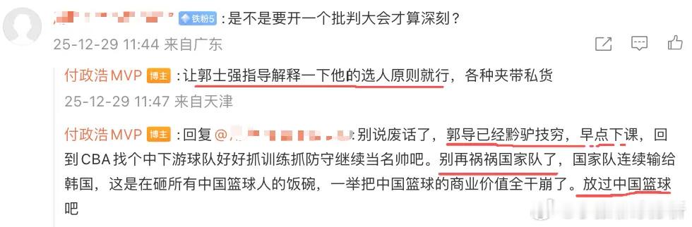 最敢说真话的媒体人!痛批郭士强:黔驴技穷,别再祸祸国家队了乔尔杰维奇下课后,不少球迷都期待中国男篮可以在洋帅方面另寻人选,结果没曾想,篮协却让此前已经证明过无法驾驭国家队的郭士强再度上任。虽然在接受媒体采访时,郭士强表示要为国家队培养年轻球员,着眼于27年世界杯和28年奥运会,但在距离世界杯就只剩下1年的情况下,中国男篮似乎还在泥沼中不断挣扎。日前,媒体人付政浩谈到了中国篮协主席在相关会议上的表态,他直言:“看了男篮世预赛的蹩脚表现,试问谁不深感压力呢?但篮协的紧迫感和责任感又体现在哪呢?比赛都结束一个月了,说好的深刻总结又总结到哪了?”而在与网友互动期间,付政浩更是直接质疑了郭士强,如此“刚正不阿”的媒体人,能够说实话,将矛头直指郭士强,放在现在确实是一股清流。付政浩在和网友互动时直言:“又开启了新一轮装模做样的CBA球员考察”,并且一针见血指出:“郭导已经黔驴技穷,早点下课,回到CBA找个中下游球队好好抓训练抓防守继续当名帅吧。别再祸祸国家队了,国家队连续输给韩国,这是在砸所有中国篮球人的饭碗,一举把中国篮球的商业价值全干崩了。放过中国篮球吧。”虽然这话确实有些难听,但付政浩真的在讲实话。上赛季郭士强曾去到现场多次考察林葳,且在此前的全运会也现身赛场,结果最后的选人依然是自己的几个关系户。高诗岩在亚洲杯虽然有过一些高光,但他已经证明自己无法胜任国家队主力后卫,结果到了世预赛,郭士强依然冒着极大的舆论压力再度将其召回。另外张镇麟在状态大幅下滑的情况下,郭士强不选择上海队另一名潜力股李弘权,也在当时引起了外界的热议。世预赛两败韩国,让中国男篮又一次陷入了风口浪尖,说好的开会总结,如今却当成没发生的事一样,大多数媒体人也保持沉默。试想一下,如果是乔尔杰维奇带队,某些苛刻的媒体人早就口伐笔诛了,但面对郭士强,却很少有像付政浩这样敢说实话的媒体人站出来。现在看来,中国男篮不仅没能在郭士强的带领下重回正轨,反倒是在泥泞中越陷越深。放着林葳、赵维伦、李弘权这些潜力股不练,反倒是让一些关系户接二连三地披上国家队战袍,倘若中国男篮真的连续无缘世界杯和奥运会,届时郭士强又要成中国男篮的罪人了。