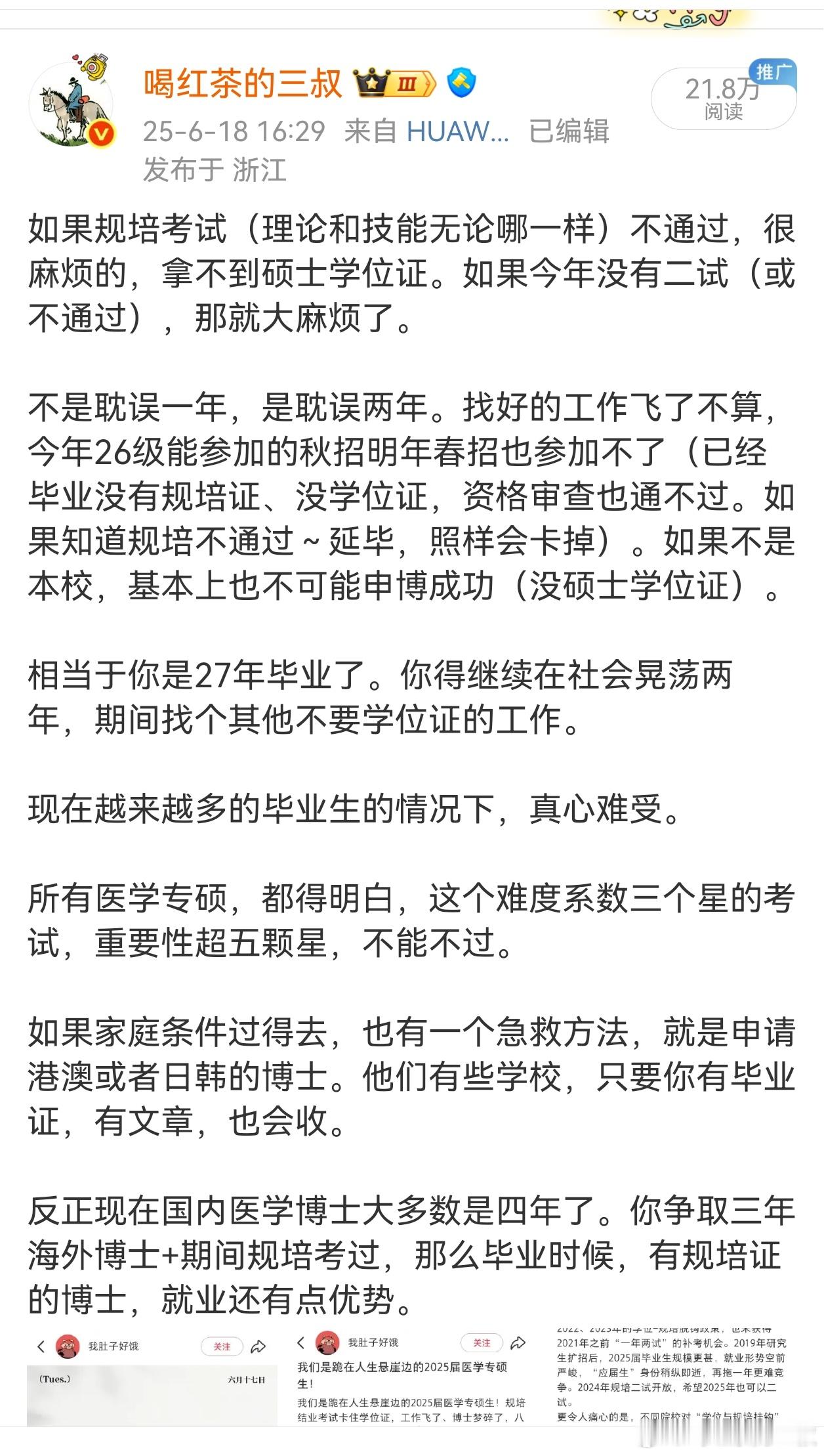 今年的规培结业考试,最后确实只有一次,没有二试。就我知道,因为上半年考试没过,本应该25年毕业的硕士,非常痛苦的在挣扎。招生是一回事,让不让你毕业~有资格找工作,从业是另外一回事。医学专硕进去第一天,就得努力考过医师资格证和规培证。你可以不替导师干活,也不要耽误这两个证书考试。当然,反正都是修理工,读机械专业也比临床医学强。