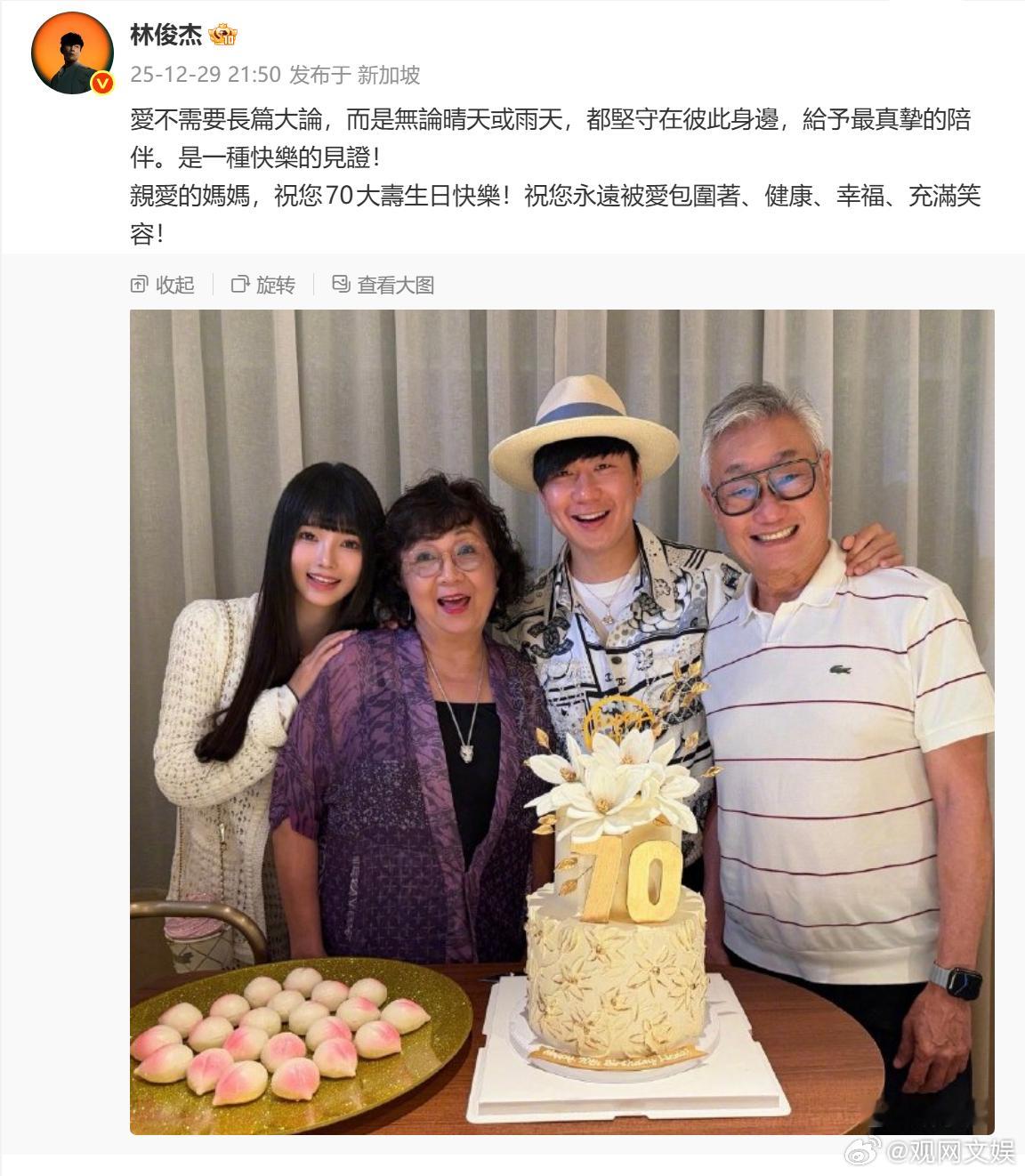 林俊杰官宣恋情29日,晒照庆祝妈妈70大寿,照片中他和女友七七一起与家人合照,正式官宣恋情。此前林俊杰与23岁女网红“七七”(annalisa77)在洛杉矶同游被拍,两人穿着情侣衫恋情曝光。林俊杰 七七