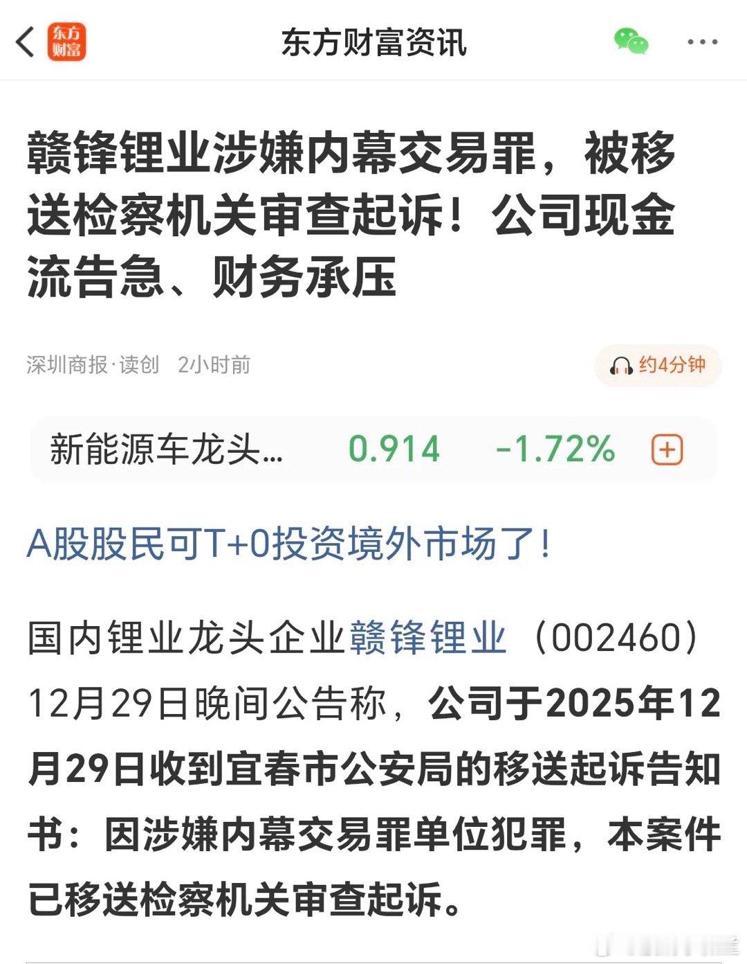 没想到啊,没想到,“浓眉大眼”的锂矿巨头赣锋锂业居然也会被起诉,而且是因为令人不齿的“内幕交易罪”而被起诉的。今晚,资本市场传来一则重磅消息,千亿市值的大牛股赣锋锂业因涉嫌内幕交易罪被移送检察机关审查起诉。这种突如其来的利空,对于赣锋锂业的37万多位股东来说,无疑是晴天霹雳。今年以来,赣锋锂业走势稳健上涨,涨幅几近翻番,妥妥的一个大牛股,市值也上涨到1400亿。然而,这则消息将彻底改变赣锋锂业的上涨趋势。会有几个跌停板呢?拭目以待!