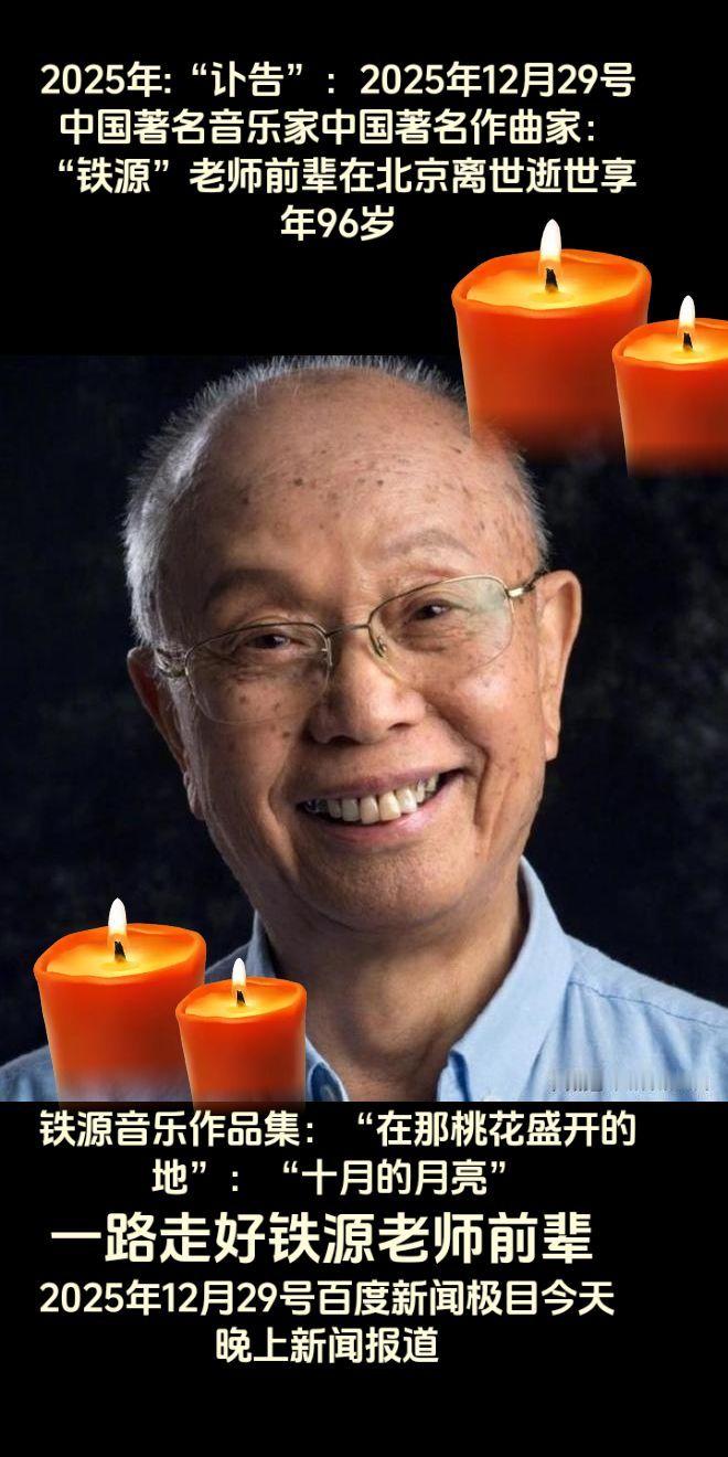 2025年12月29号中国著名表演艺术家中国词作曲家铁源老师前辈与今天上午在首都北京离世逝世享年96岁:“一路走好铁源老师前辈”央视6公主蓝羽与:“十五的月亮”