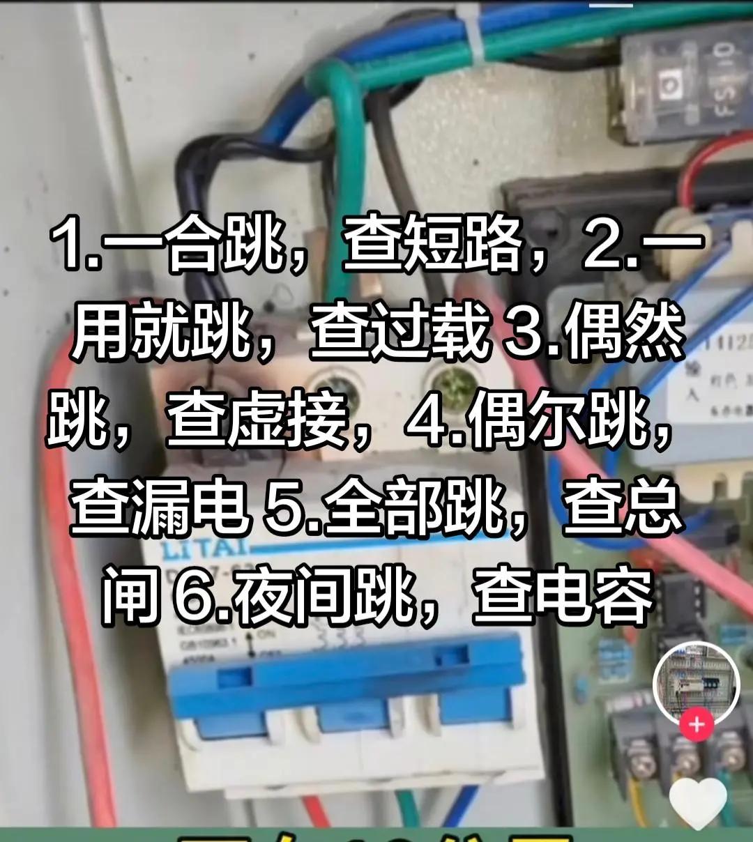 1.一合跳,查短路,2.一用就跳,查过载 3.偶然跳,查虚接,4.偶尔跳,查漏电 5.全部跳,查总闸 6.夜间跳,查电容