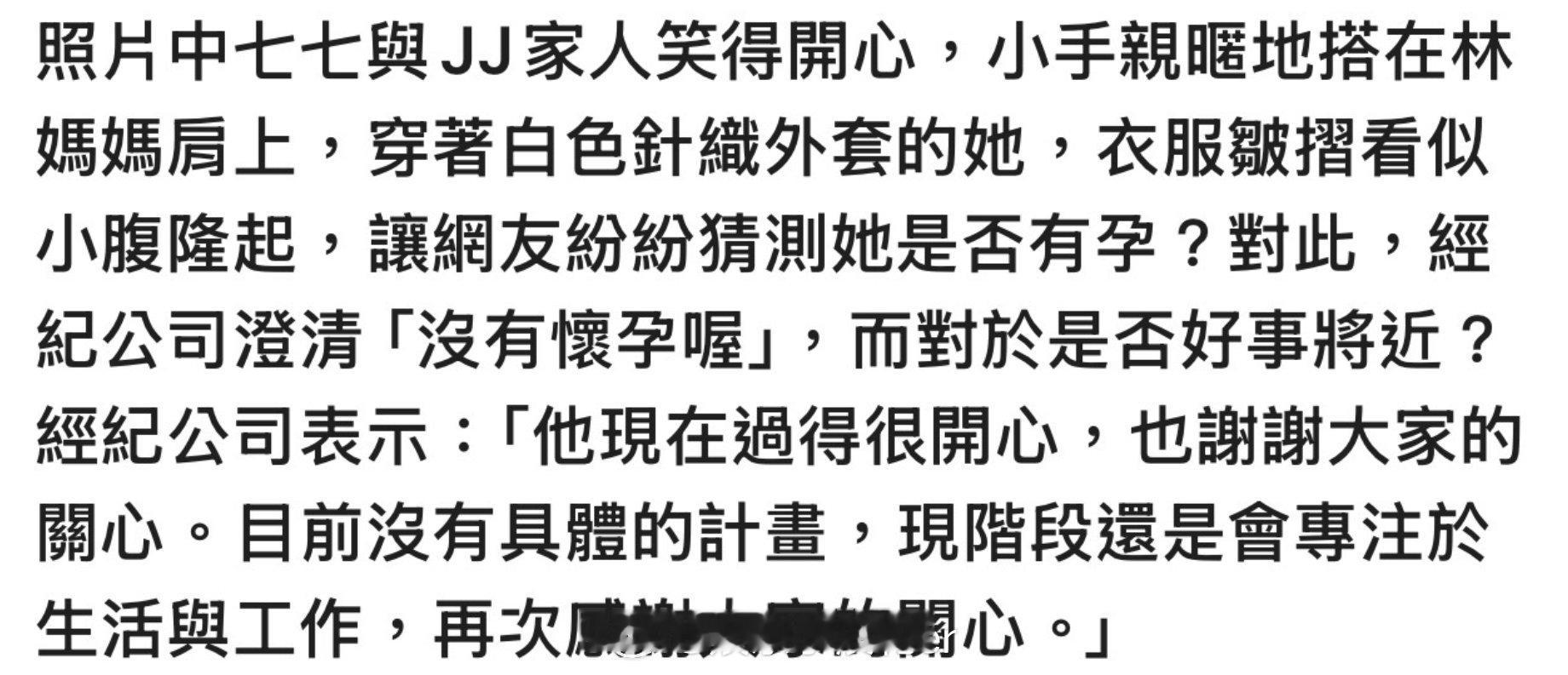 公司否认林俊杰女友怀孕林俊杰方否认女友怀孕 28日林俊杰官宣恋情 ,网友猜测合照中女友七七有孕相。刚刚,经纪公司回应称:“没有怀孕。”并表示林俊杰现在过得很开心,也谢谢大家的关心。“目前没有具体的计划,现阶段还是会专注于生活与工作。”