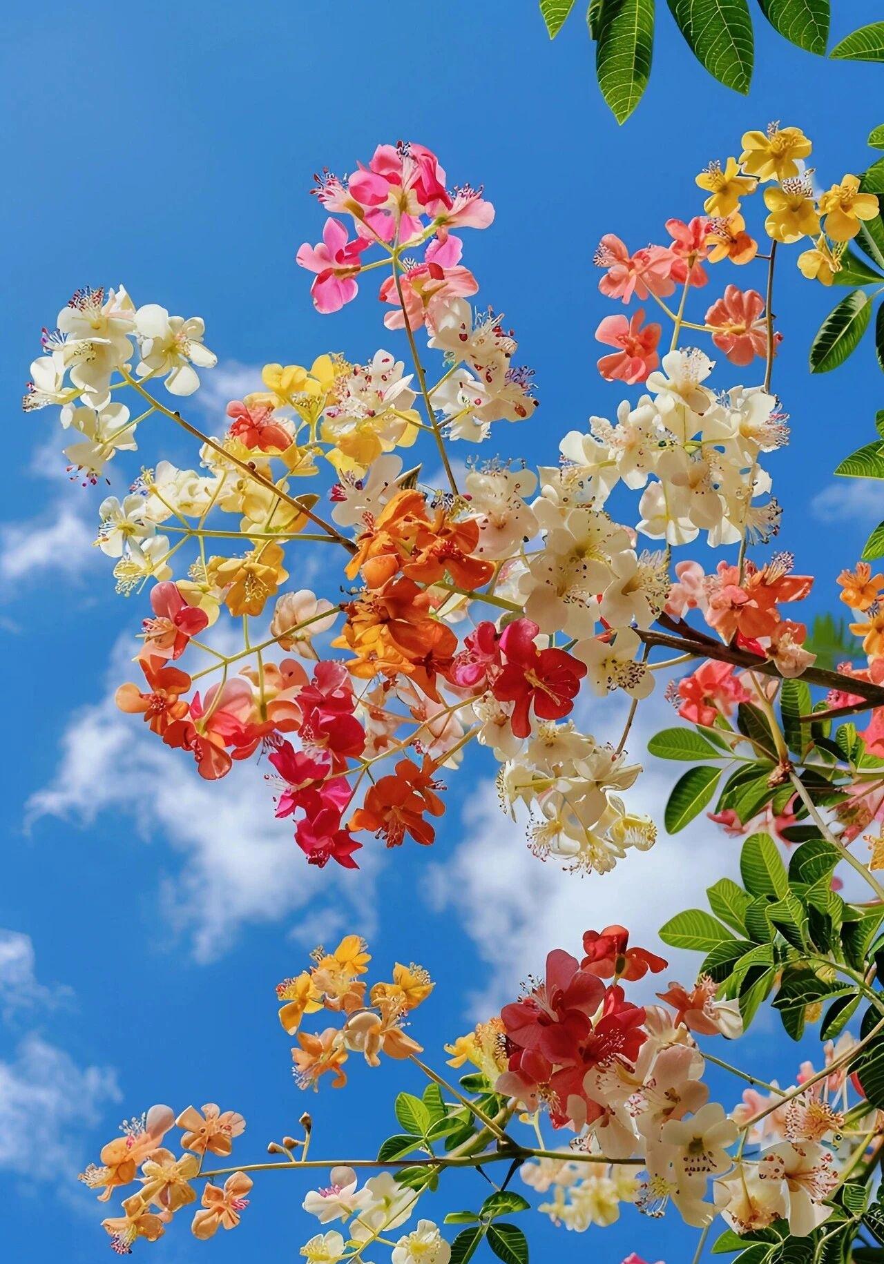 湛蓝天空下,一簇五色梅正肆意绽放。粉的娇嫩、橙的热烈、黄的明媚、白的素雅,还有那抹胭脂红,像打翻了的调色盘,在枝头晕染开一片绚烂。细长的花蕊顶着金色粉末,在阳光下闪烁着细碎光芒,仿佛撒了把星星在花瓣间。 绿叶托举着繁花,脉络清晰可见,边缘微微卷起,透着健康的光泽。偶有清风拂过,花枝轻颤,彩蝶般的花瓣便在蓝天下翩跹起舞,抖落一地斑驳光影。几朵调皮的云儿从花隙间探出头来,为这幅浓墨重彩的画卷添了几分灵动。 原来春天从未走远,它只是把所有的温柔,都酿成了这满枝的锦绣。