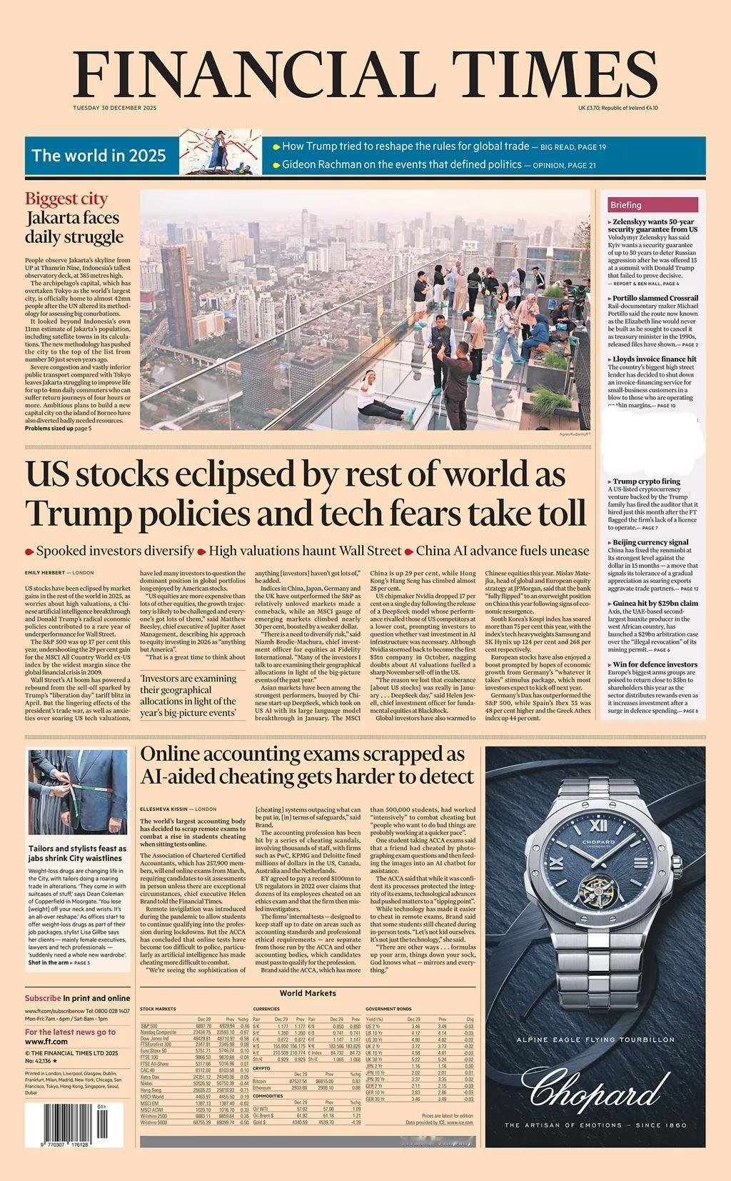 《金融时报》报道,2025年美国股市被全球其他地区的市场涨幅所掩盖,原因是人们对高估值、中国人工智能突破以及唐纳德·特朗普激进经济政策的担忧。 照片显示,最大的城市雅加达面临着日常的艰难处境 。人们在印度尼西亚最高的观景台——高达385米的谭林九酒店上空俯瞰雅加达的天际线。 这个群岛国家的首都已超过东京成为世界最大城市,在联合国改变评估大城市的方法后,其官方人口接近4200万。 它的统计范围超出了印度尼西亚自己对雅加达1100万人口的估计,将卫星城镇也纳入计算。新方法使这座城市从仅仅七年前的第30位升至榜首。 与东京相比,雅加达严重拥堵,公共交通也极为糟糕,这使得多达400万日常通勤者难以改善生活,他们的返程时间可能长达四个小时甚至更长。在婆罗洲岛建造新首都的宏伟计划也转移了急需的资源。