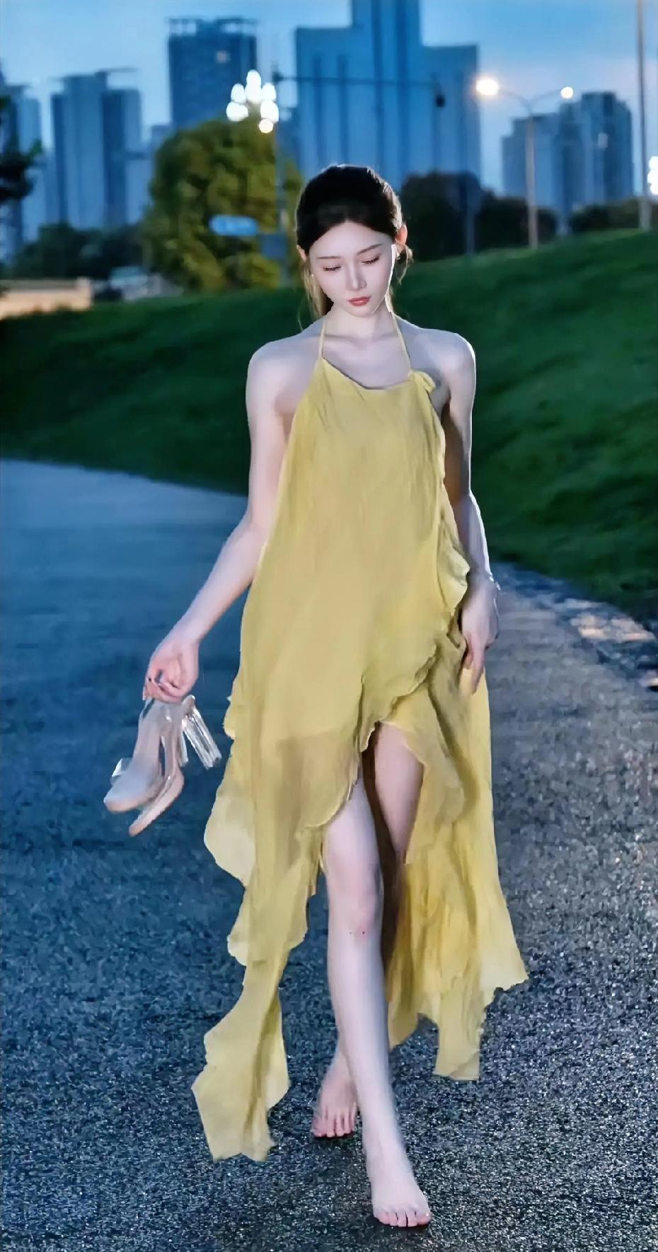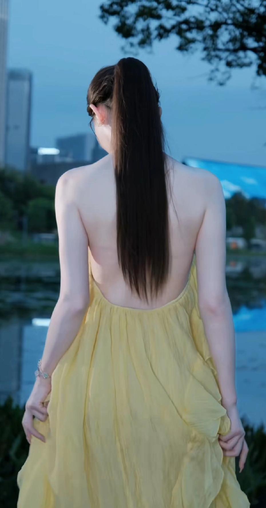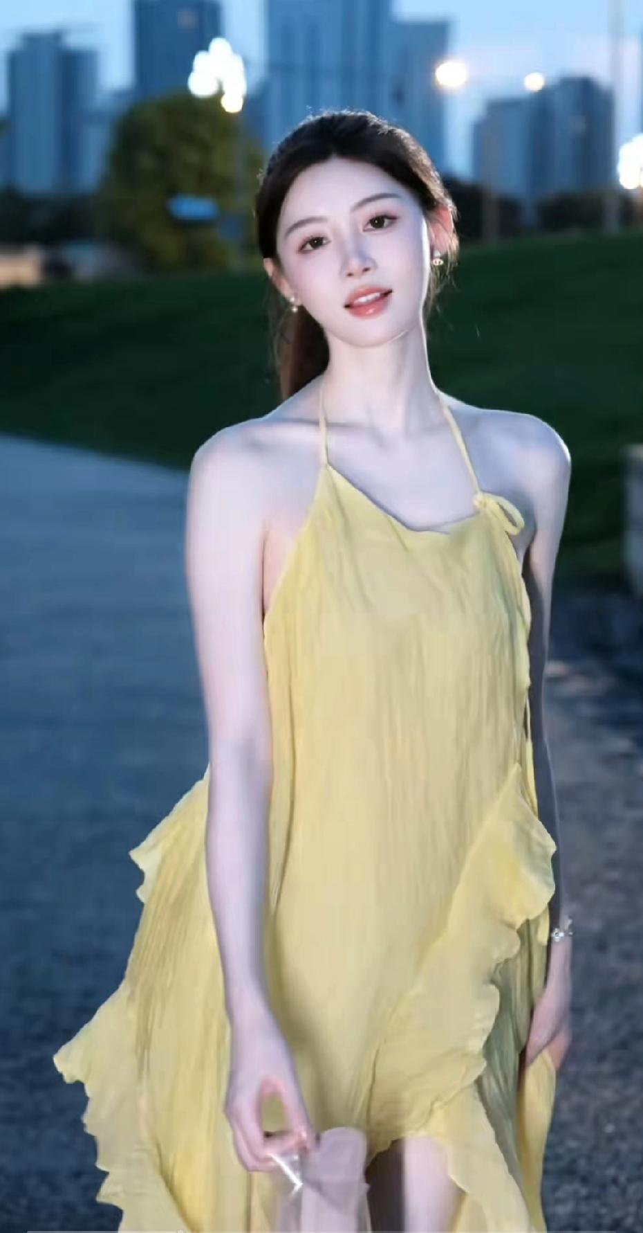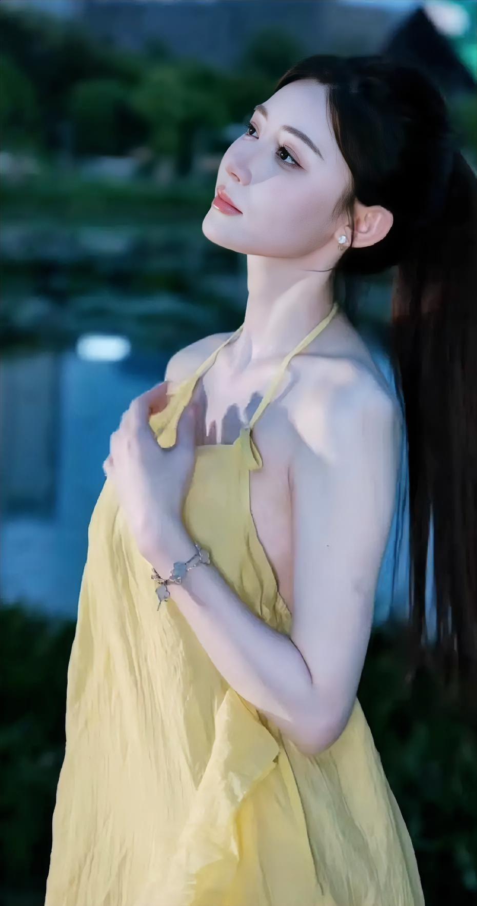 黄衣美人倚水畔,风姿绰约似画中。
