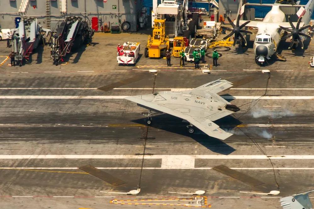 美国海军无人X-47B登陆在航空母舰西奥多·罗斯福号(CVN 71)上。该飞机完成了一系列测试,展示了其安全且无缝地与载人飞机协同作战的能力。