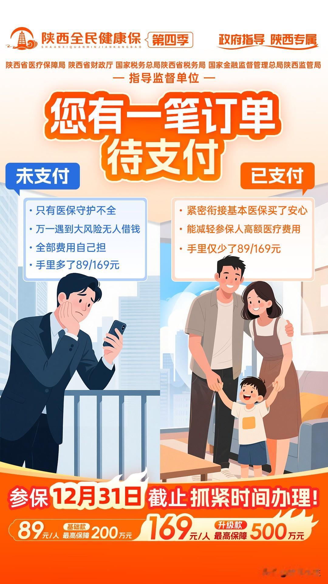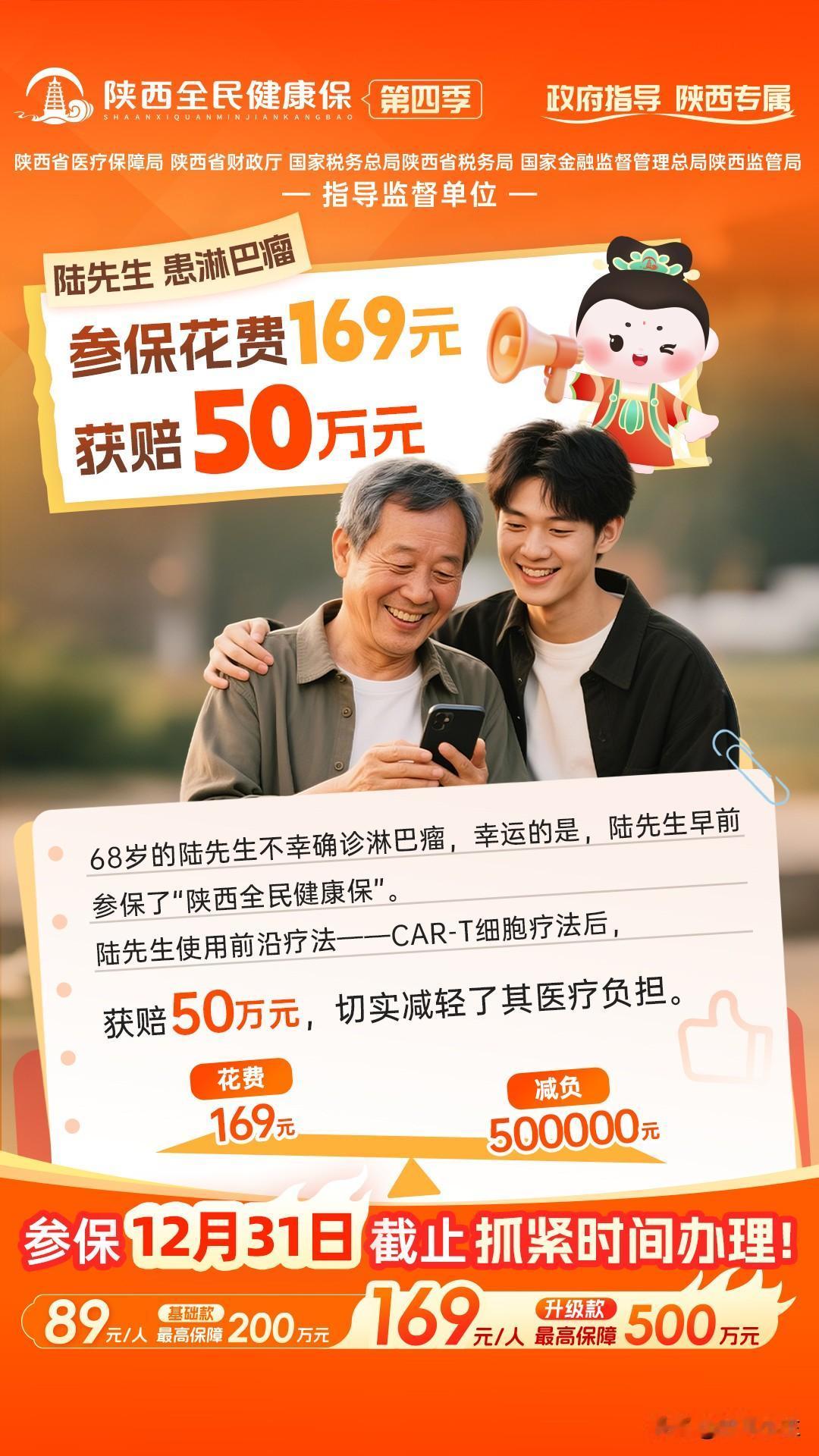 我总是听到这样一句话,对自己好点,因为生命是自己的。所以今天我要提到健康这个话题。作为陕西的老乡,更应该多多了解陕西全民健康保,这是关乎你和你的家人的一件大好事。 因为第四季已经上线,而且亮点多多,你需要对这个保险提高一下主观认识,首先它有政府做指导,而且有基本医保+陕西全民健康保,双重保障更安心。而且由省内21家保险公司联合推动。 参保更是放宽了诸多限制,凡陕西省基本医保参保人或陕西新市民均可自愿参保,不受年龄、职业、户籍、身体状况限制。所以可以这样理解,只要你想参保就能保上。 而且有两个版本可供选择,基础款和升级款。基础款89元/人/年,可有200万的保障,升级款169元/人/年,最高500万保障,享16项健管服务。 也许你支付了89元或者169元,你的生活不会变得拮据,但是你会在意外来临之时多了一份保障。所以很多人会说保险就是花小钱办大事,就看你的认识了。 升级款有优惠扶持,不要忘了。如果未出险;一次性为家庭内三人及以上投保缴费(限于为同一投保人的配偶、子女及父母投保缴费),保费是139元/人/年。 记住在定点医疗机构就医,出院即赔,免垫资、少跑腿、不等待。 参保时间截止至2025年12月31日