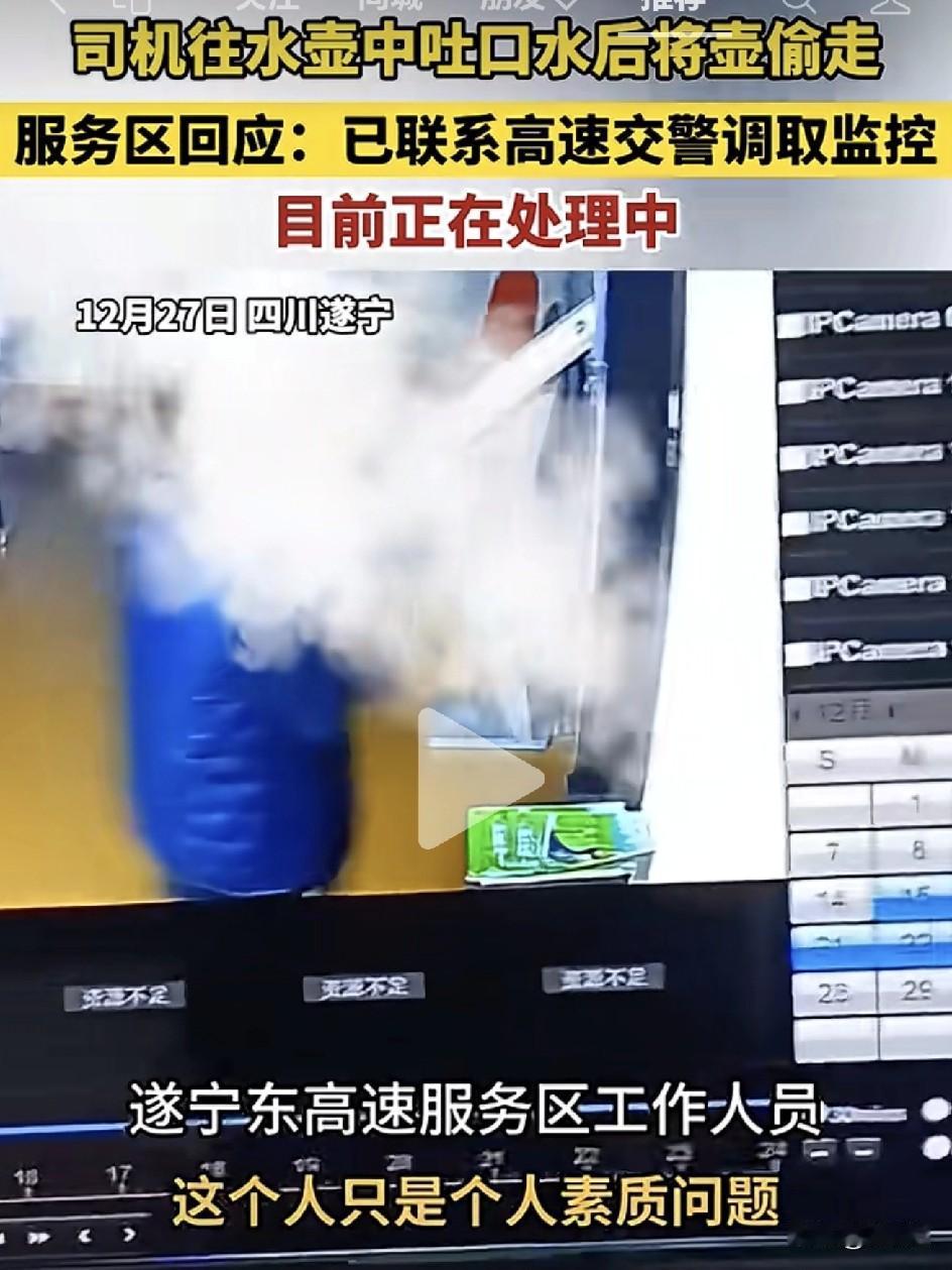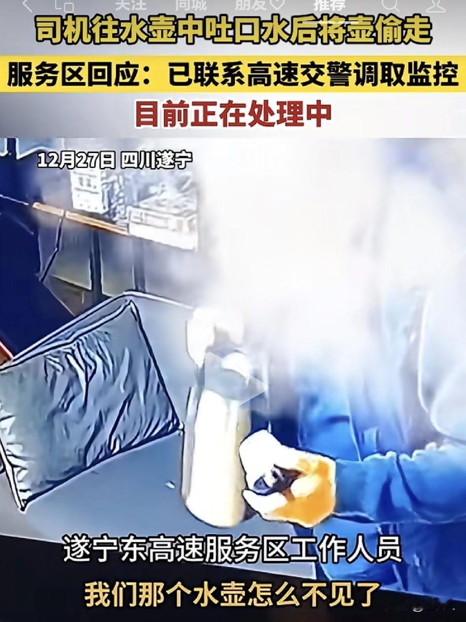 恶心坏了!服务区男子先往公共水壶里吐口水,接着居然又把水壶偷走了,网友:这人素质掉地上了! “司机之家”本是给长途师傅们歇脚、接水、喘口气的暖心驿站,没想到竟成了某些人“放飞自我”的舞台。 近日,四川遂宁东高速服务区,一名男子的迷惑操作让人直呼反胃:他居然往公共水壶里吐口水,吐完还顺手把壶拎!走!了! 监控拍下全程,画面引起强烈不适。服务区工作人员也无奈回应:“已经联系高速交警处理,这就是个人素质问题……” 目前警方正全力追踪这名“吐壶侠”。网友集体愤怒: “好家伙,别人接水,你接‘口水配方’?” “偷壶我还能理解,吐口水是图啥?留个纪念?” “建议查查这人是不是对‘壶生’有什么执念……” “这是把壶偷回去,喝自己的口水吗?” “赔十个水壶并拿着水壶在服务区门口站一天!” “所以说都知道,为啥饮水机焊架子了吧!” “丢司机人!” 出门在外,文明不能丢!服务区的便利是给大家的,不是给某些人“加戏”的。 希望这位大哥早日被找到,好好解释一下——这壶,是藏着什么童年梦想吗? 素材来源:法治进行时,侵联删!