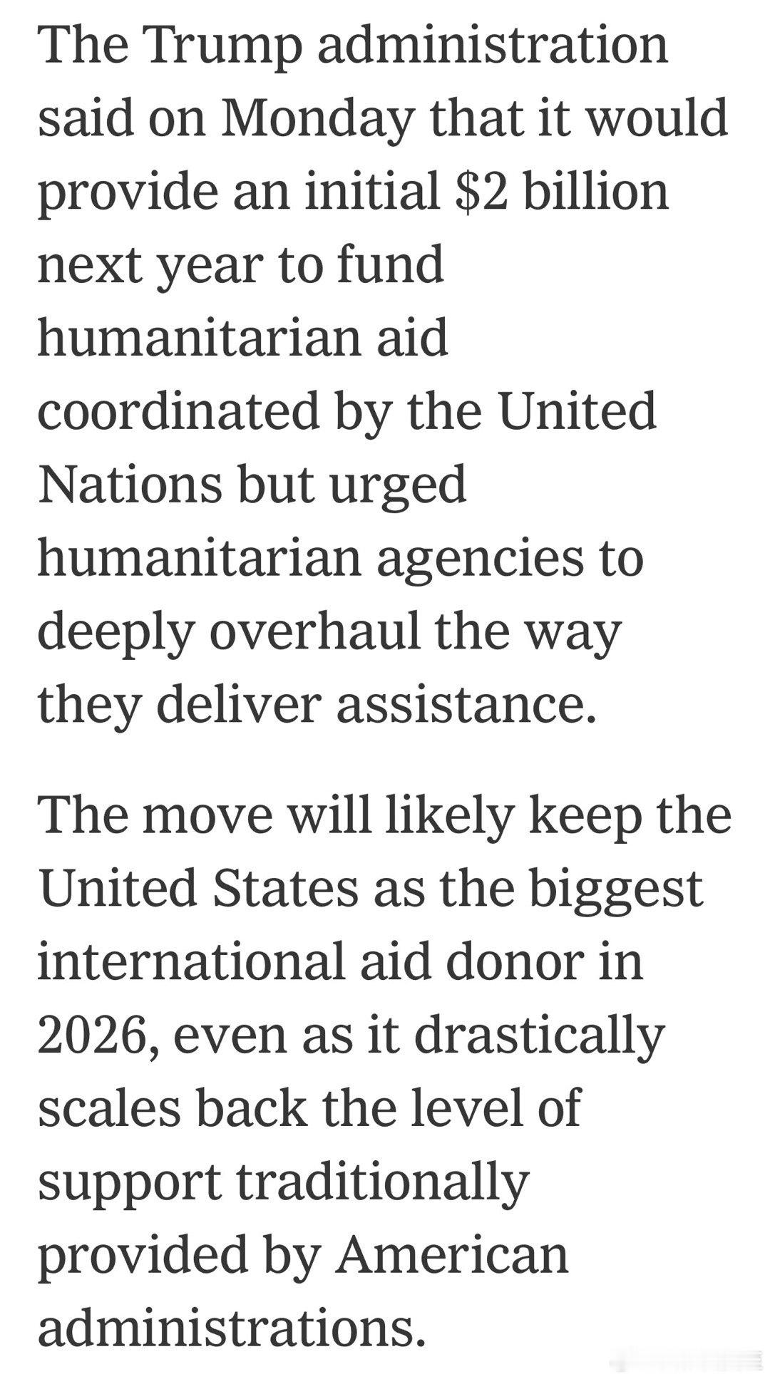 2025年,美国向联合国人道主义援助项目,共注资$33.8亿,占全球总捐款额的14.6%~依然是首位,但远低于正常年份常见的比例:至少三分之一今天,美国政府宣布:2026先捐二十亿~依然最多但美国要求联合国各部门:调整、缩减、或消失