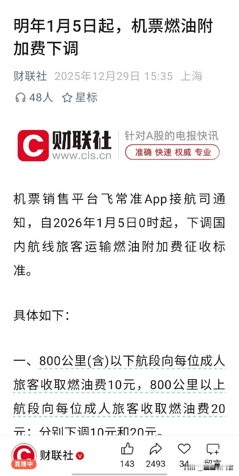 【机票燃油附加费大降!A股这3个板块要“捡钱”?普通人看懂就能跟上!】 家人们,机票又要便宜啦!刚收到消息:2026年1月5日起,国内机票的“燃油附加费”直接砍半——800公里以下航线(比如北京到郑州),每人只收10块钱(降了10块);800公里以上(比如北京到广州),收20块(降了20块)!连小孩、军警都有优惠,婴儿直接免单! 这事儿看着是乘客省钱,其实对A股影响不小!简单说:机票便宜→坐飞机的人多了→相关公司生意好→股价可能蹭蹭涨!具体看这3个板块: 1. 航空公司:直接“减负”,股价最先嗨! 燃油费是航空公司用来对冲油价成本的“保护费”,现在降了,相当于成本少了,压力轻了!而且机票总价低了,买票的人肯定多(尤其春运、寒假这种旺季),航空公司客座率上去了,利润自然涨。 举个栗子:国航(601111)、东航(600115)、南航(600029)这些大航司,还有做支线的小航司华夏航空(002928),都是直接受益的!消息一出,今天航空股已经有点动静了,后面估计还得涨。 2. 旅游公司:间接“躺赚”,错峰游要火! 机票便宜了,出去玩的人不就多了吗?尤其是长线游(比如跨省游),以前嫌贵改高铁的,现在可能改坐飞机了。旅游公司(比如旅行社、在线订票平台)的订单肯定多,特别是元旦、春节后的“错峰游”,性价比更高,生意肯定火爆! 举个栗子:中青旅(600138)这种做长线游的,还有同程旅行(虽然是港股,但A股旅游股也会跟涨),都能沾光。 3. 物流快递:长期“省钱”,龙头偷偷乐! 你可能不知道,快递、货运很多是靠飞机运的!燃油费降了,航空货运的成本就低了,快递公司(比如顺丰)的利润空间就大了。而且油价便宜,整个物流行业的成本都降,龙头公司(规模大、效率高)更能抢市场,日子过得美滋滋。 举个栗子:顺丰控股(002352)、京东物流(港股),还有做物流园区的传化智联(002010),都是潜在受益的。 注意!别光看利好,也有风险: - 万一油价又大涨,航司可能再把燃油费涨回来,利好就没了; - 要是大家还是不想出门(比如经济不好),机票再便宜也没人买,股价也白搭; - 物流竞争本来就激烈,成本降了可能打价格战,小公司反而吃亏。 总结:这次燃油费下调,本质是“让利给乘客,带动消费”,航空、旅游、物流这三个板块最受益!手里拿着这些股票的,可以偷着乐;没买的也别急,看看后续走势,别追高就行~ 记住:投资不是赌运气,看懂逻辑再下手!觉得有用就转发给炒股的朋友,一起薅羊毛!今日A股 旅游 航空 燃油附加费 燃油附加费下降