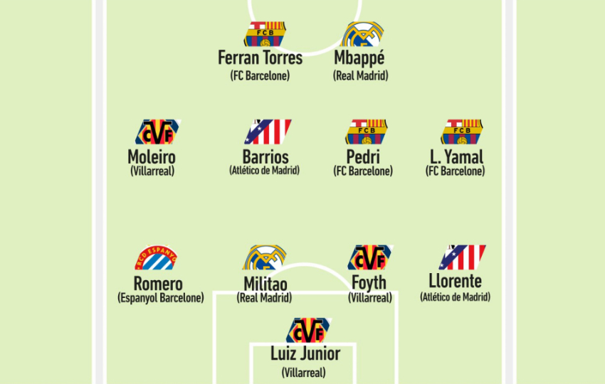 队报:《姆巴佩、亚马尔、莫莱罗…… 队报评选西甲半程最佳阵容出炉》Mbappé, Lamine Yamal, Moleiro... Notre équipe type de Liga à la mi-saison17 轮战罢,巴塞罗那队以 4 分优势领跑西甲积分榜,领先卫冕冠军皇家马德里。巴塞罗那西班牙人队则成为本赛季开赛阶段的一匹黑马,凭借稳固的防守表现脱颖而出。以下便是我们评选的西甲半程最佳阵容。赛季才刚过半程,除非出现局势逆转,西甲冠军奖杯大概率将再度在巴塞罗那与皇家马德里之间展开角逐。目前两队分别以 46 分、42 分位列西甲积分榜榜首与次席,且已领先身后的追赶者不小差距 —— 马德里竞技(37 分)、比利亚雷亚尔(35 分)以及本赛季的黑马球队西班牙人(33 分)紧随其后。本次评选的最佳阵容,我们决定采用 4-4-2 阵型。考虑到本赛季西甲联赛汇聚了众多高水平前锋,这一选择几乎是必然之举。比利亚雷亚尔以仅失 15 球的防守数据,成为本赛季西甲防守最稳固的球队(失球数比两支马德里球队还少 1 粒),其门将路易斯・儒尼奥尔更是在出场场次占比上,完成零封次数最多的门将(7 次零封)。因此,他毫无悬念地成为我们最佳阵容的首发门将。在他身前,俱乐部队友胡安・福伊特将坐镇后防线右中路。这位阿根廷后卫场均可完成 4 次抢断,位居同位置球员前列 —— 仅皇马的埃德尔・米利唐在该项数据上能与之抗衡。而米利唐则当选我们的另一位主力中卫:这位巴西铁卫几乎以一己之力扛起了 “白衣军团” 的后防大梁。哈维・阿隆索麾下的球队之所以能稳居积分榜次席,很大程度上要归功于他在后防线上的卓越贡献。边后卫位置上,我们选择了右路的马科斯・略伦特与左路的卡洛斯・罗梅罗。这两位球员特点相近,不仅跑动覆盖范围极大,进攻端的贡献也相当突出 —— 两人合计贡献 3 粒进球和 6 次助攻。火力全开的边锋搭档,锋芒初露的中场组合佩德里与巴勃罗・巴里奥斯坐镇中路,拉明・亚马尔和阿尔韦托・莫莱罗两翼齐飞,这套中场配置的平均年龄仅 21 岁。不过年轻绝不意味着经验匮乏 —— 佩德里和亚马尔早已捧起 2024 年欧洲杯冠军奖杯,还曾跻身欧冠半决赛;巴里奥斯则跟随马德里竞技,年年征战欧冠联赛。唯有莫莱罗尚未涉足欧战与国际大赛的舞台,但年仅 22 岁的他,已经代表比利亚雷亚尔和拉斯帕尔马斯累计出战超过 150 场职业比赛。亚马尔与莫莱罗两人合计贡献 13 粒进球、9 次助攻,堪称全欧洲最高效的边锋组合之一,其强大的进攻火力可见一斑。尽管佩德里饱受伤病困扰 —— 赛季至今已两度因伤缺阵 6 场比赛,但这份最佳阵容中若没有他的一席之地,简直是难以想象的。他在球场上的每一秒,都在印证自己是当今世界足坛最顶尖的球员之一。出色的大局观、精准的传球脚法、攻守两端的全能贡献,这位西班牙球星完全具备跻身最佳十一人的所有特质。在他身旁,马德里竞技的 “瑰宝” 巴勃罗・巴里奥斯,同样是这支防守至上球队的中场发动机。他是队内少有的兼具前插推进与持球突破能力的球员,这也是他深受主帅迭戈・西蒙尼器重的关键所在。联赛 1305 分钟的出场时间便是最好的佐证,这一数据让他跻身阿根廷教头麾下出场时间前三的非门将球员之列。基利安・姆巴佩是这套最佳阵容的双前锋人选之一。作为西甲当之无愧的射手王(斩获 18 粒进球),这位代表法国国家队出战 94 场的国脚,正是皇家马德里如今稳居积分榜次席的头号功臣。倘若没有他的贡献,“白衣军团” 的处境恐怕会截然不同。与他搭档锋线的是巴塞罗那前锋费兰・托雷斯 —— 他成功完成了一项壮举,将罗伯特・莱万多夫斯基挤上了替补席。职业生涯期间,无论是效力瓦伦西亚、曼城,还是初登诺坎普的阶段,费兰・托雷斯都屡遭诟病,但本赛季开赛以来,他凭借 11 粒进球证明,自己拥有跻身欧洲顶级豪门主力九号位的实力。替补蒂博·库尔图瓦(皇家马德里)、何塞·马里亚·吉梅内斯(马德里竞技)、莱昂德罗·卡布雷拉(西班牙人)、奥雷利安·楚梅尼(皇家马德里)、豪尔赫·德·弗鲁托斯(拉约·巴列卡诺)、马库斯·拉什福德(巴萨)和朱利安·阿尔瓦雷斯(马德里竞技)。姆巴佩西甲